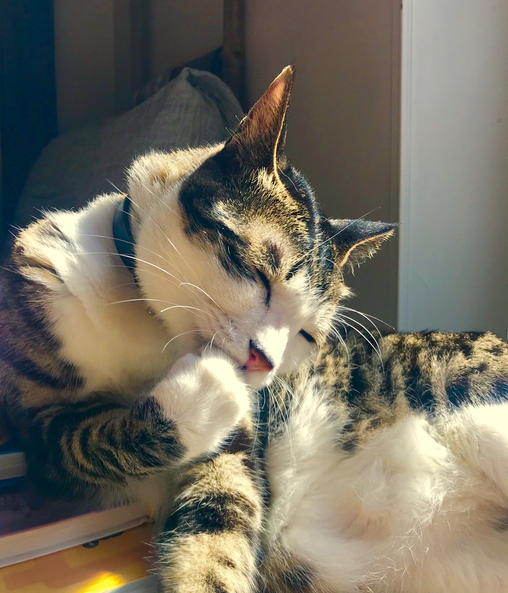 실제로 냥이들은 저렇게 그루밍을 하면 엔돌핀이 나온다는데 햇살 아래에서 하는 그루밍은 비타민D 생산에도 도움이 된다고 하니 자기 관리가 나보다 철저한 우리집 냥이가 아닐 수 없다. 덧붙여 집사가 핸드폰 카메라를 들이대면 나타나는 저 표정들은 자기가 어떻게 하면 귀여운지 아는 사랑받아 마땅한 영리하고 매력적인 고양이의 특성을 잘 보여준다.