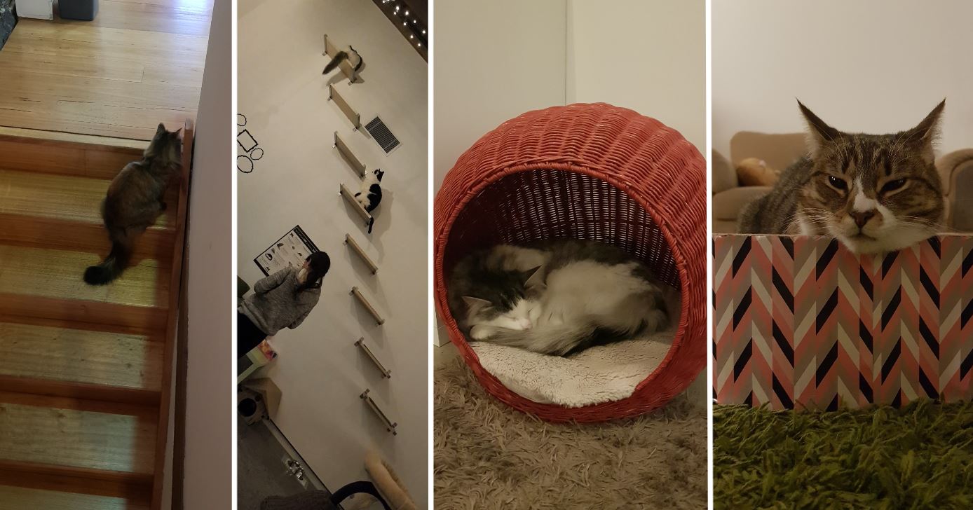 The first that caught our eyes was the set up and thought to ourselves that Soju would love to have this. What I loved was how they placed bird seeds outside the windows to attract the birds for the cats to see. I might look into doing something like this for Soju. She would love it. What I also liked was the bridge which crosses the room up above. It had a hammock like section in the middle, ‘purrr-fect’ for a cat nap.