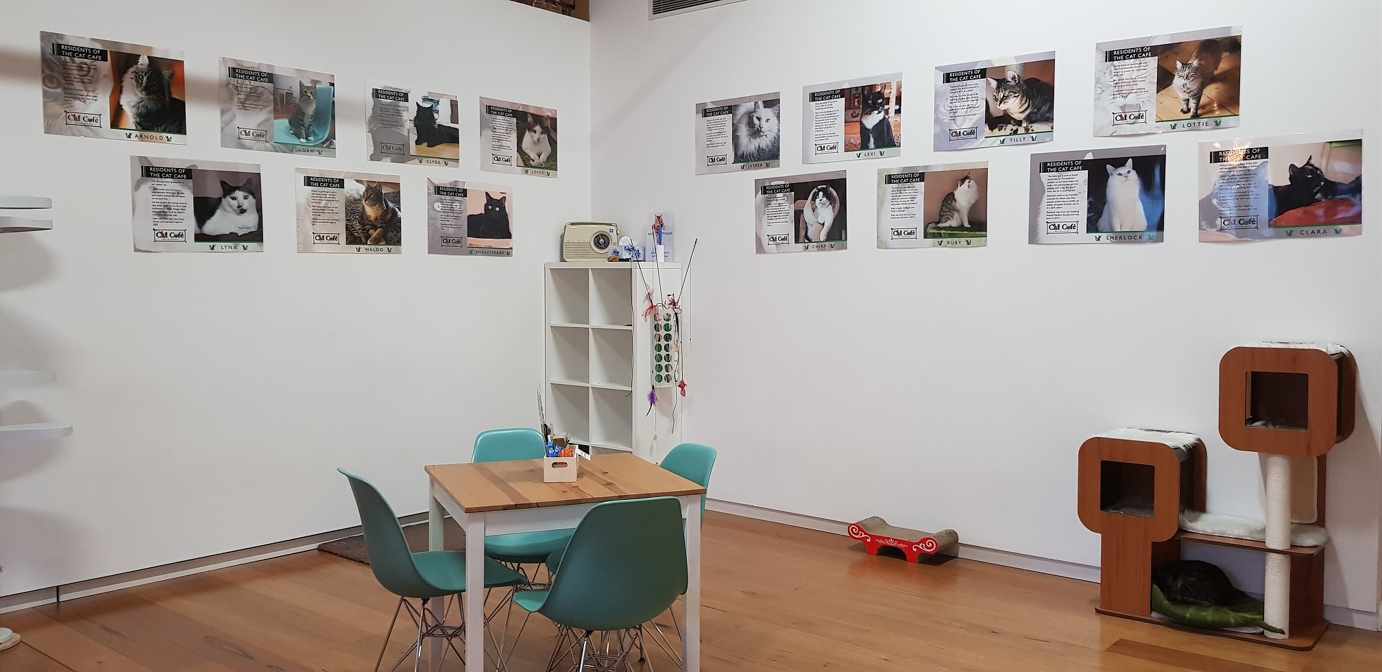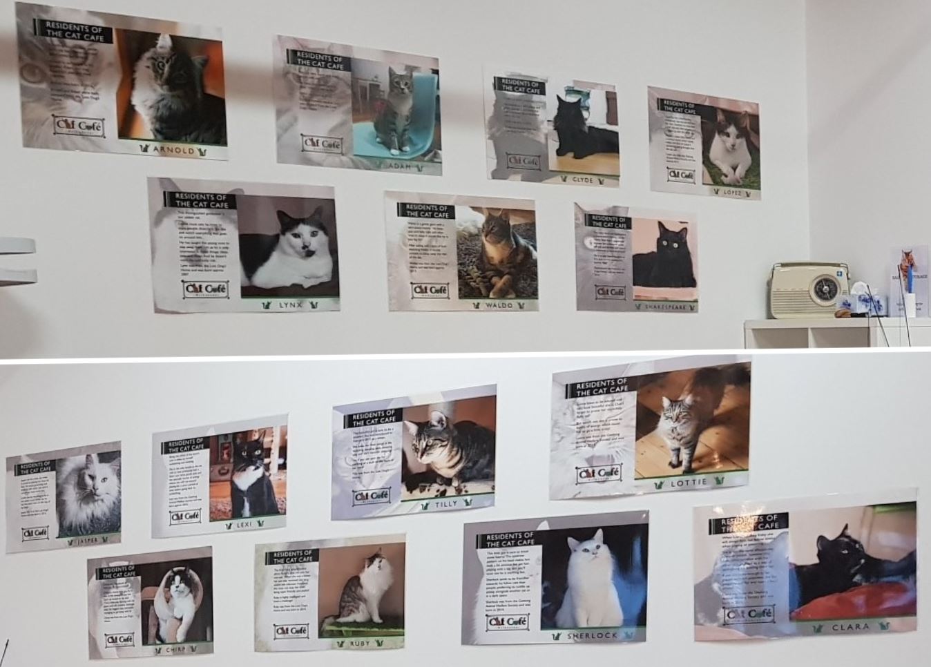 On the walls they had images and names of the cats residing at the Cat Café, include a small synopsis of the cat’s history and personality.