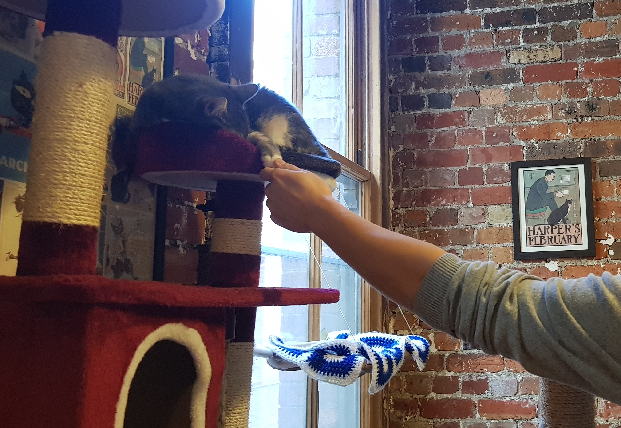 The cats were living the life, multiple large cat trees, plenty of spots for naps and bird watching. These cats love to nap. They were not as active as Soju, however they were probably tired of people constantly wanting to play with them.