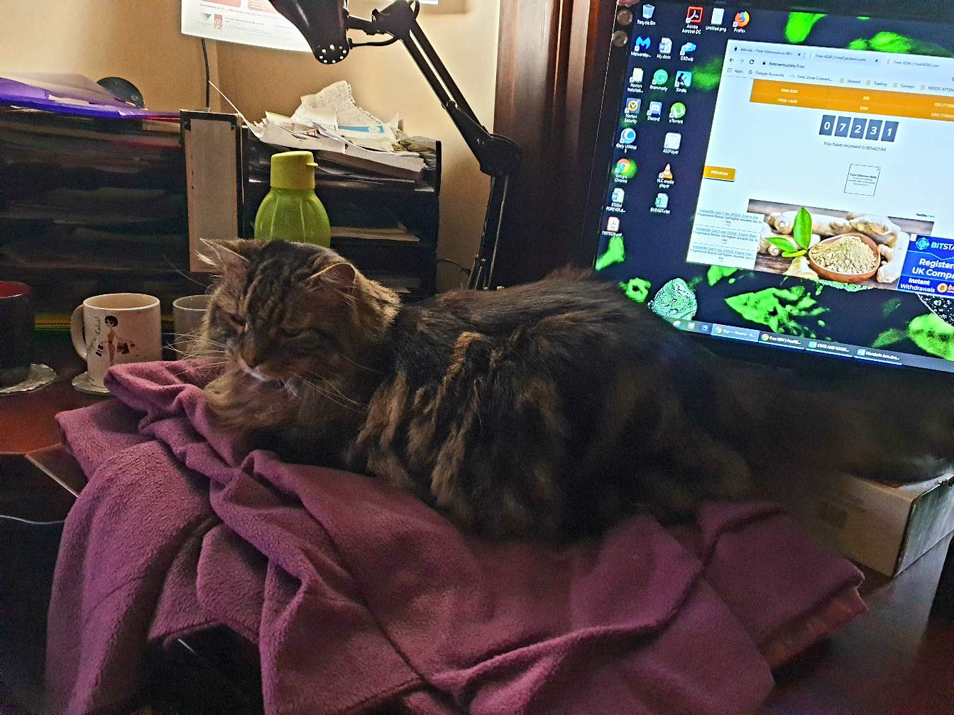 He continues to position himself on the computer desk, although now he will jump up in front us and be waiting for love and pats as though it was his spot this whole time. Yesterday I was sitting at the desk working on my laptop and he startled me by jumping up without realising he I had paperwork on the desk, so he slips most ungraciously and I catch him in mid-fall.