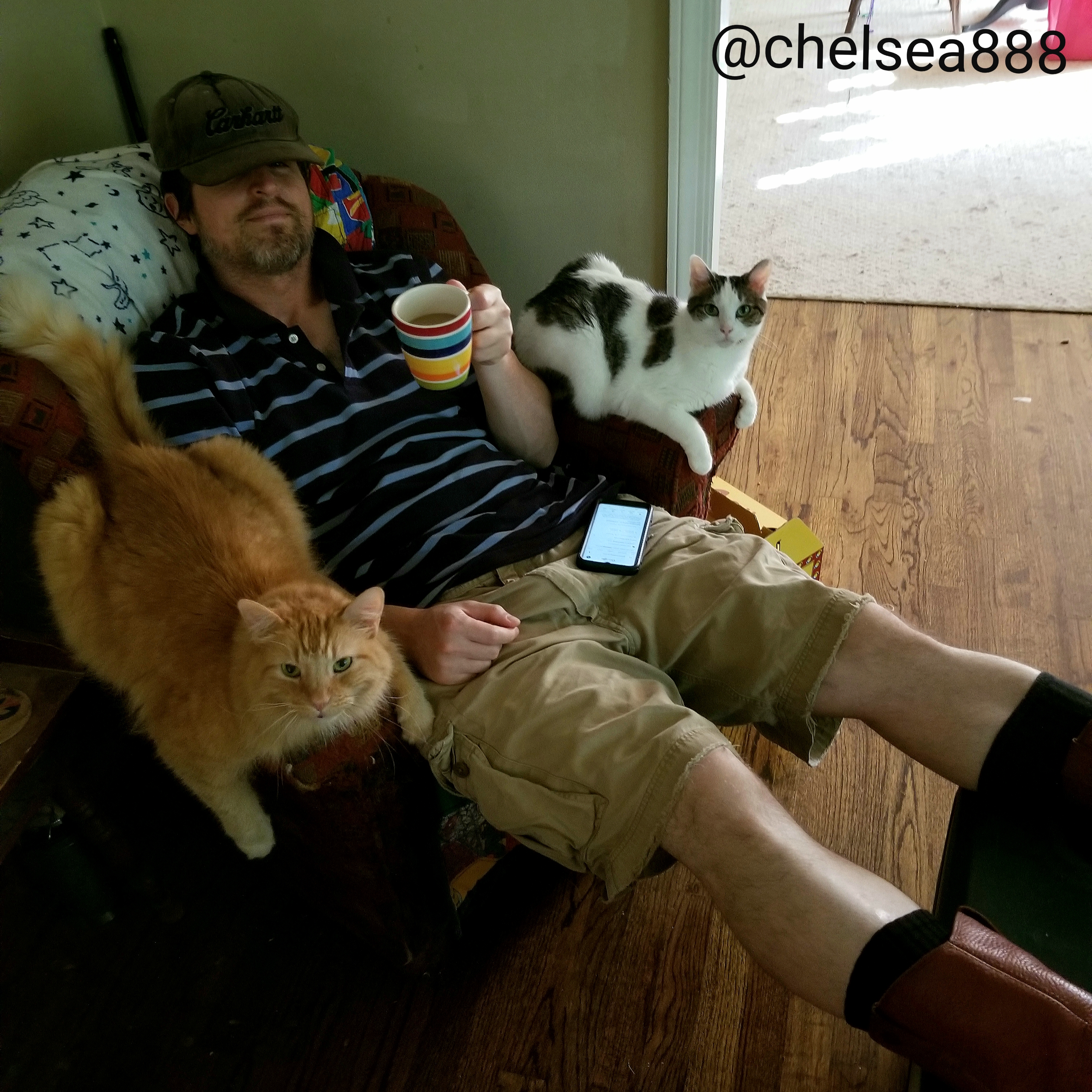 Spots is female and took a liking to the bf much quicker even though she can be a bit standoffish to some people. Big boy is typically a Mama's boy but I don't like him being propped beside me as I am drinking coffee due to his long, fluffy hair could get in my beverage. Gross! Love him anyway though. <3