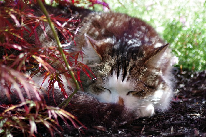 Here he is cat-napping under a tree in the shade garden.