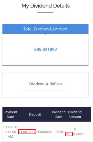 약 2 BTC의 예치금으로 41만원의 배당을 지급 받은 것 입니다.