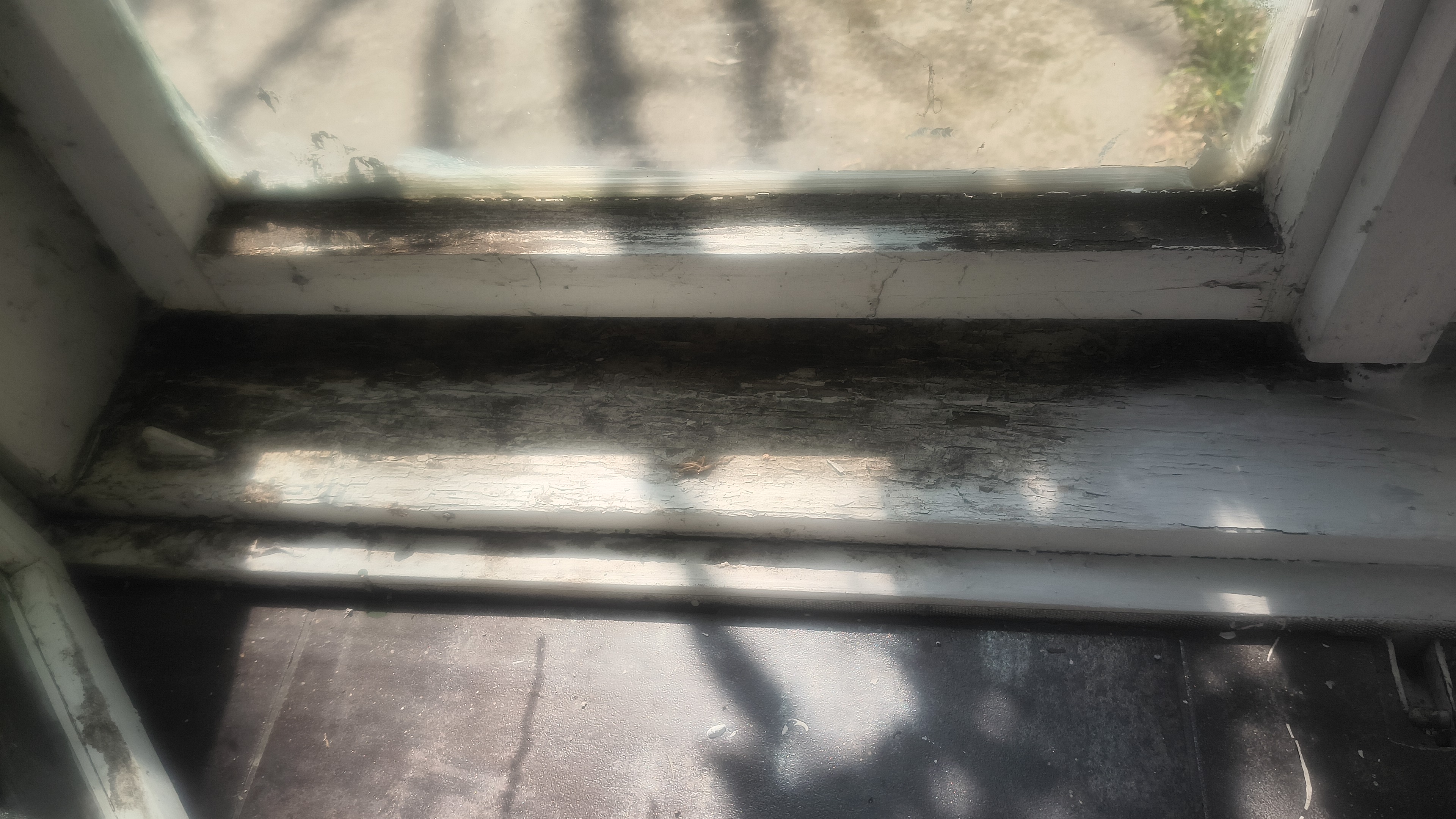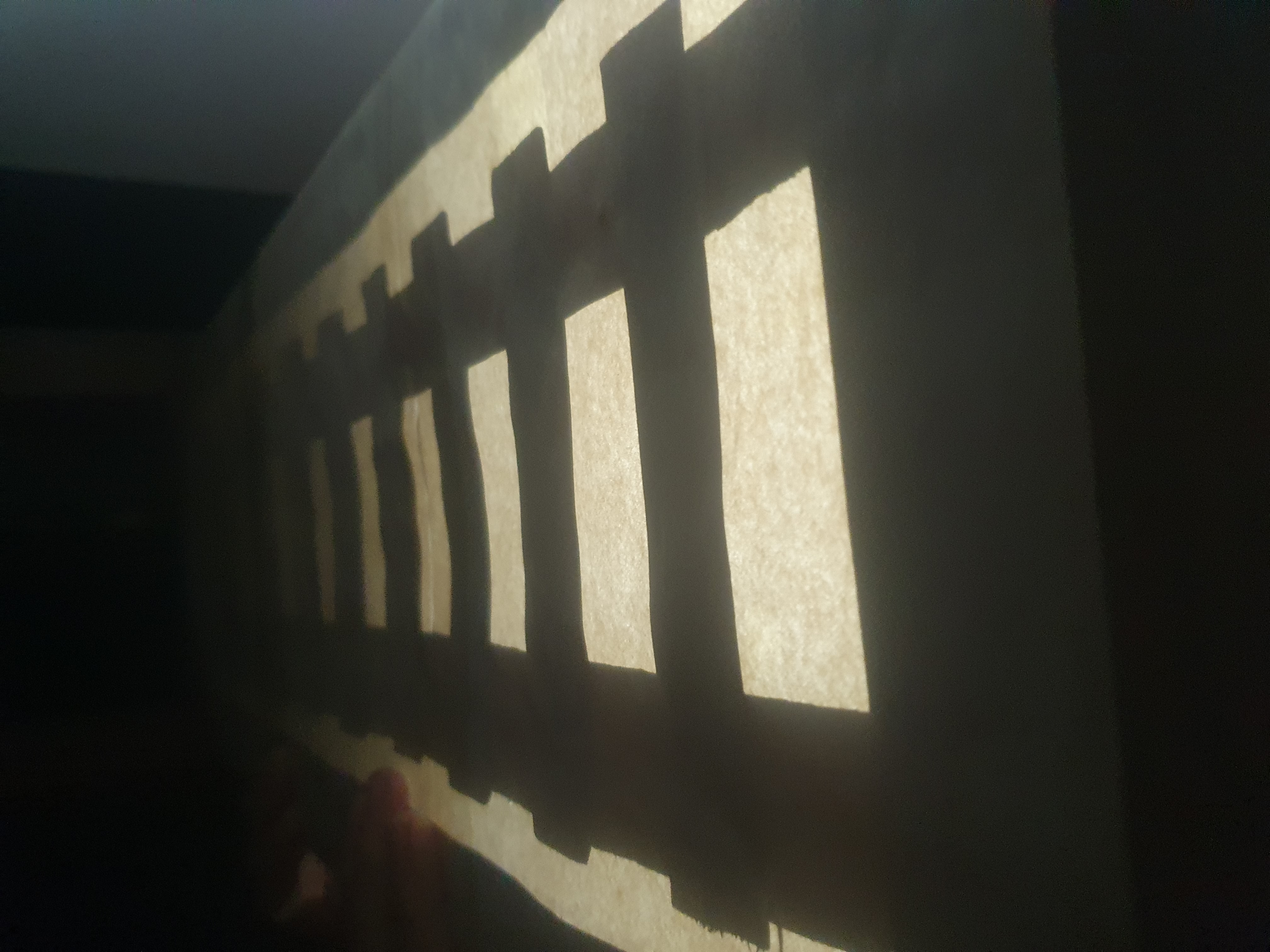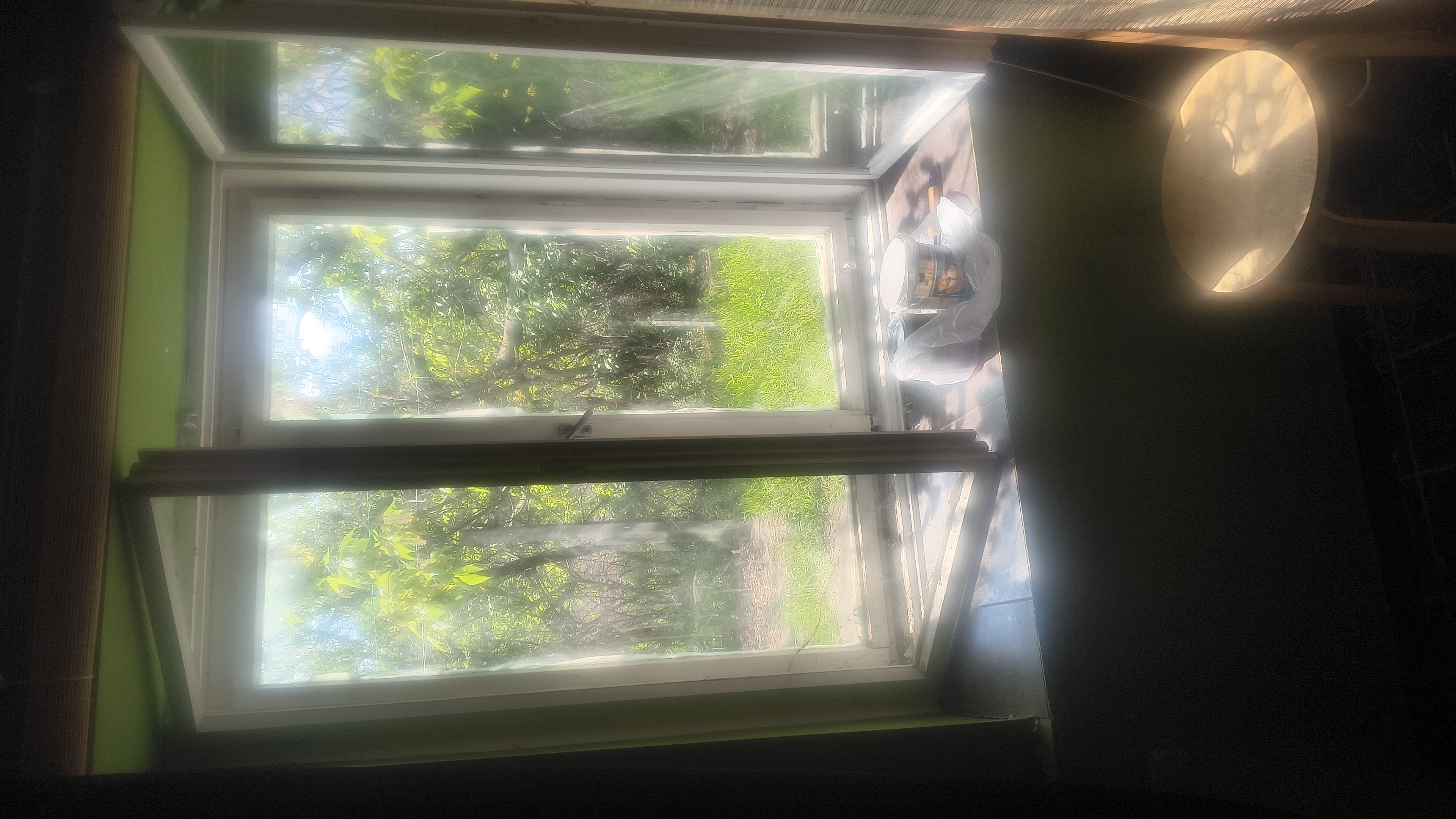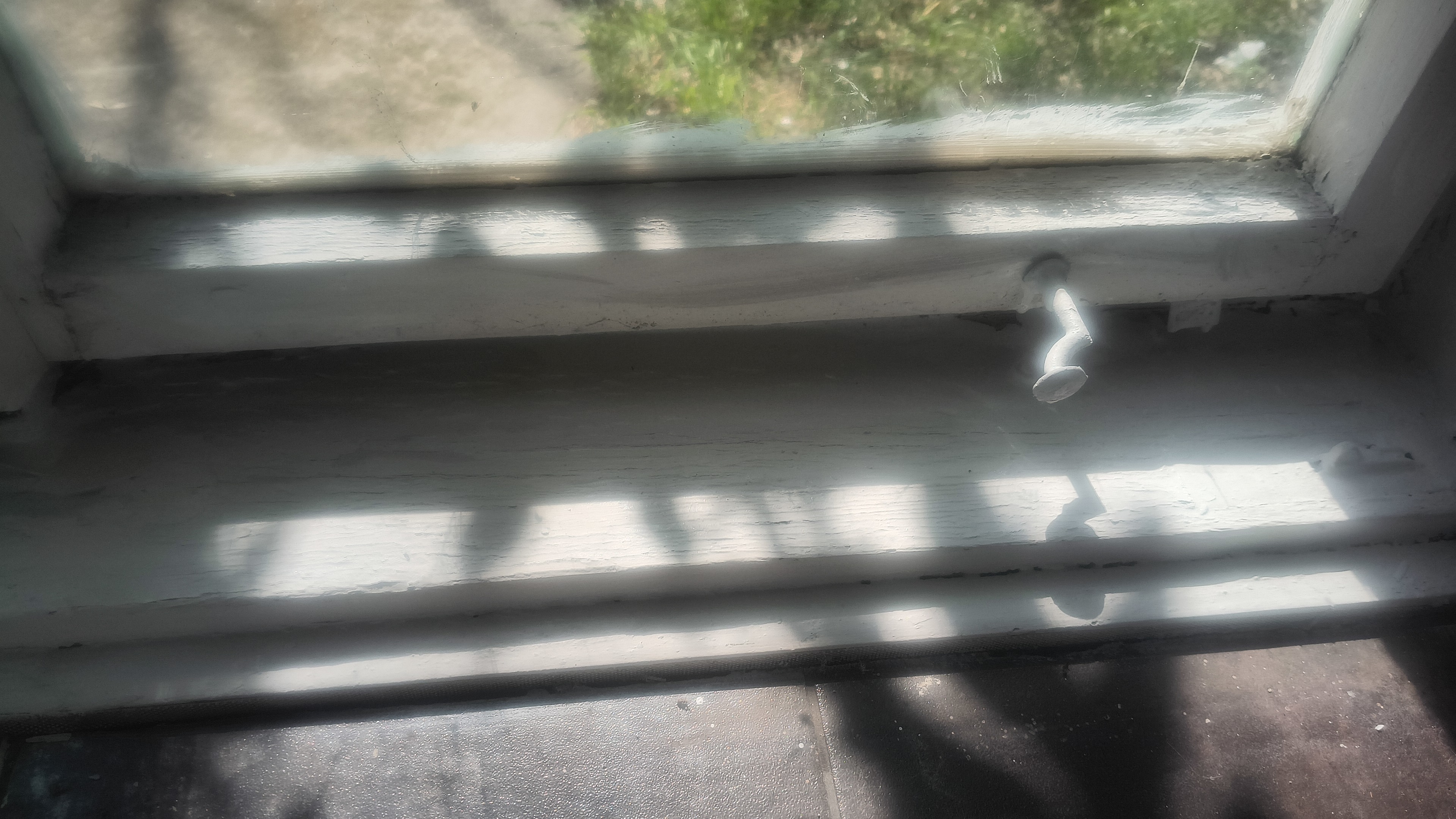 Strange how unclear a shadow is once the sun shines through the windows. Windows? Yes. This is old-fashioned double glass. By now the outer window cannot be opened anymore and the inner windows are stuck due to the lousy job some worker did. The opening was just big enough to paint a part of the frame white. For now I won't place the wooden window partitions back. It is the first time in 14 years...