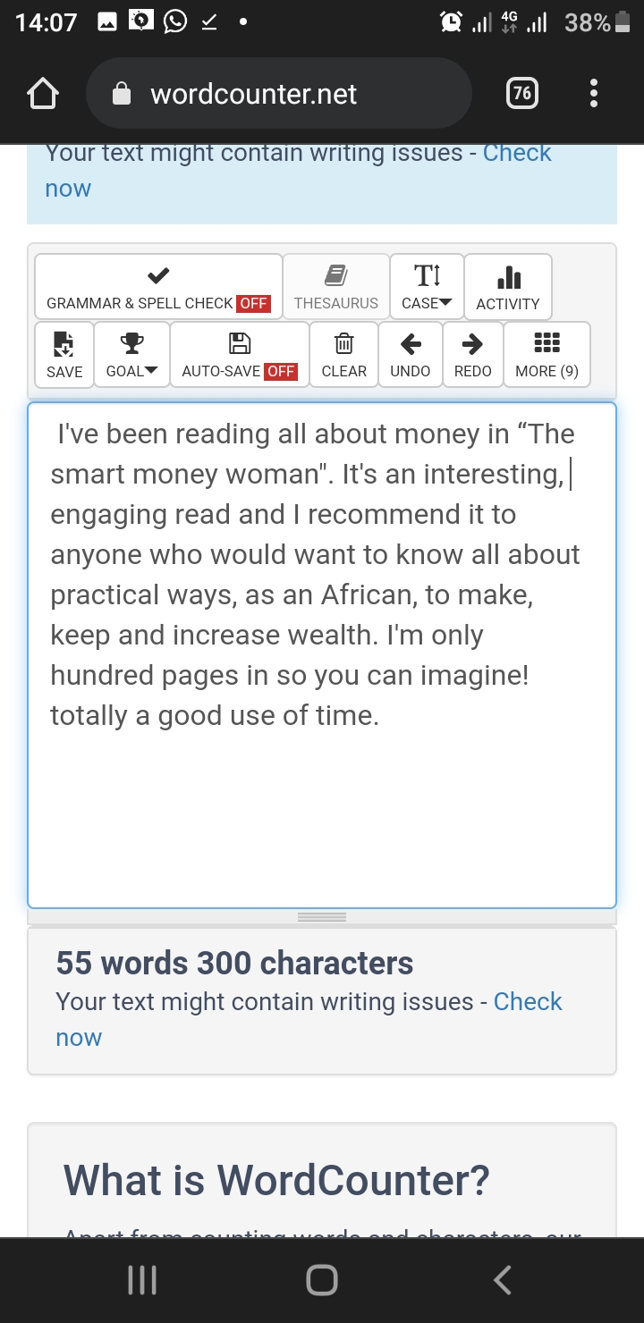 I've been reading all about money in “The smart money woman". It's an interesting, engaging read and I recommend it to anyone who would want to know all about practical ways, as an African, to make, keep and increase wealth. I'm only hundred pages in so you can imagine! totally a good use of time.