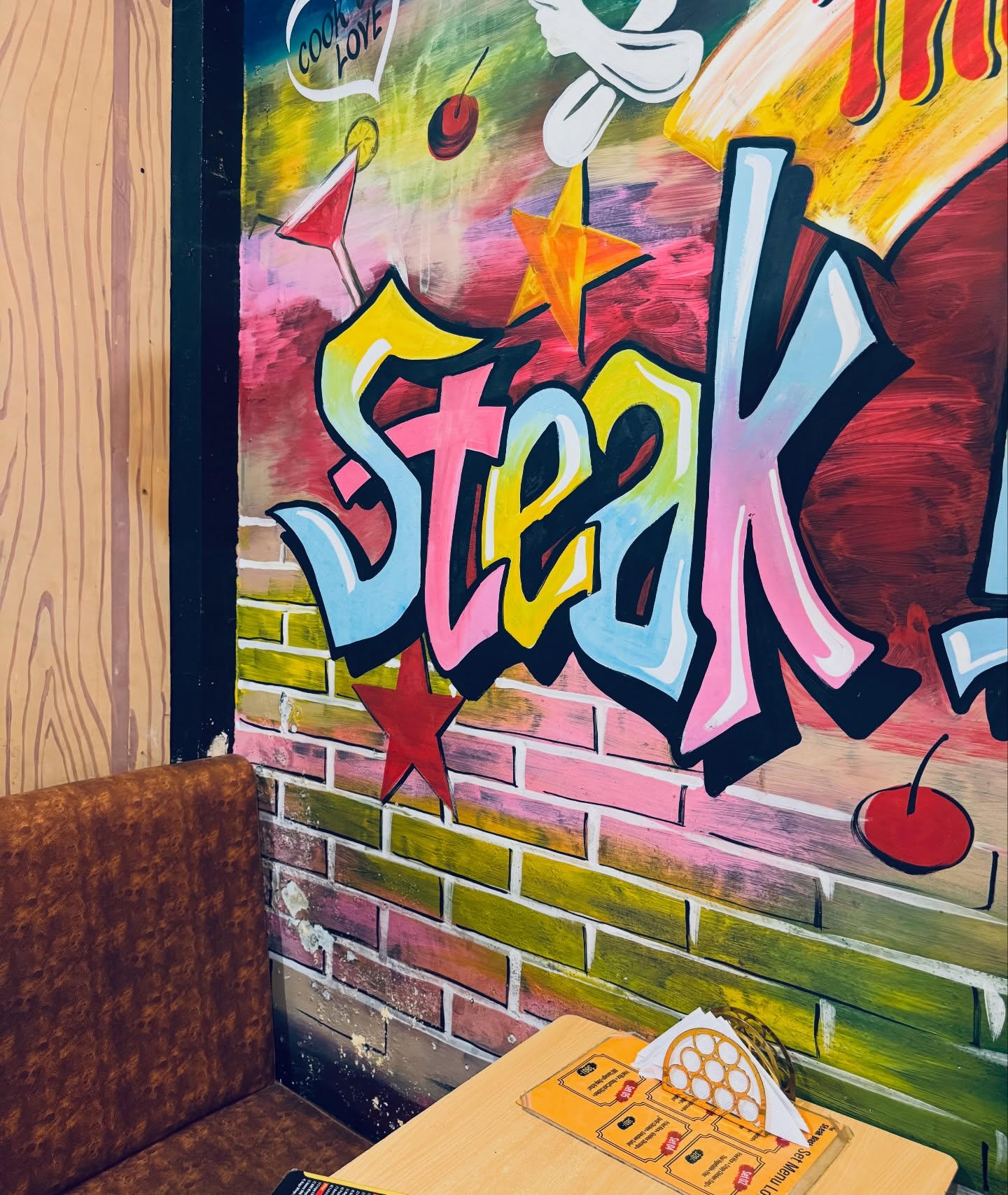The colorful spray paint style lettering "Steak" on a brick wall makes a great backdrop. It's the perfect spot for a photo.