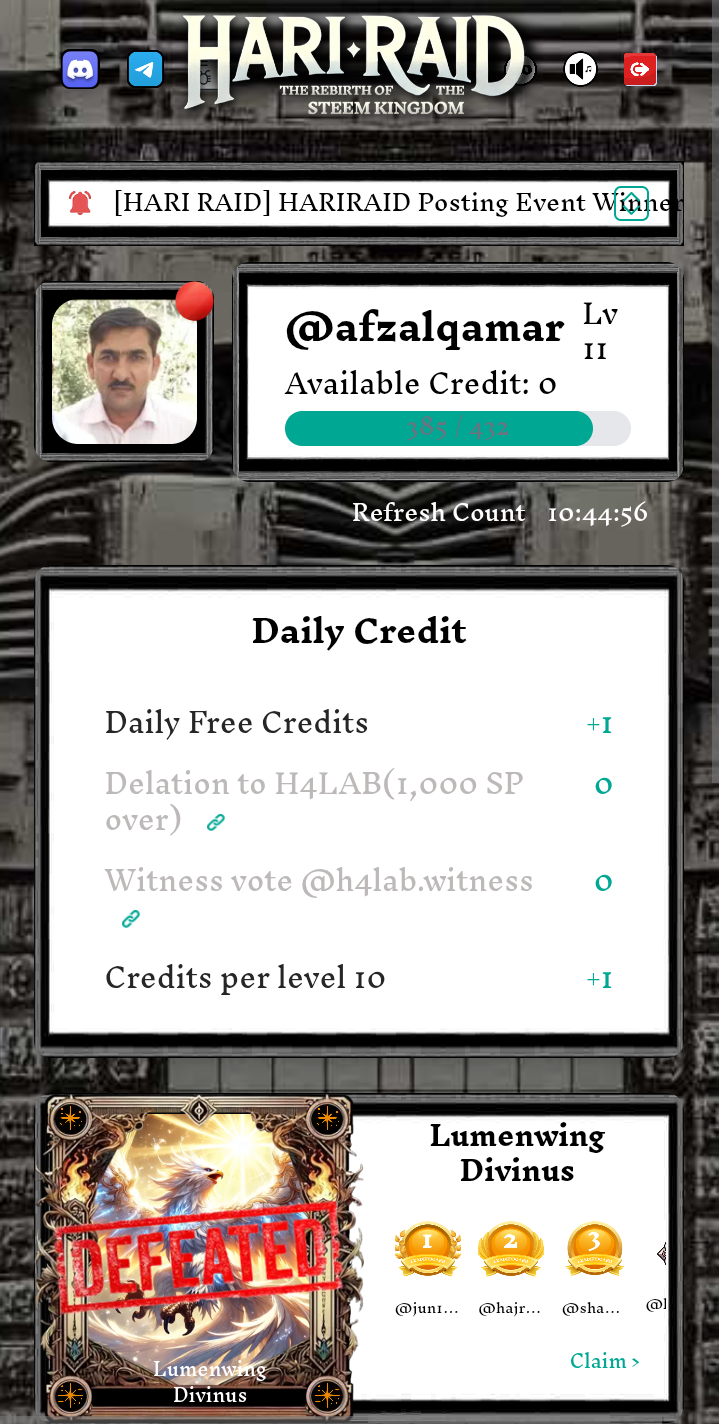 Today I opened the game and my rank not available because monster has been Defeated and my level was still at 11. You can see in the screenshot and the available credits are 385/432.