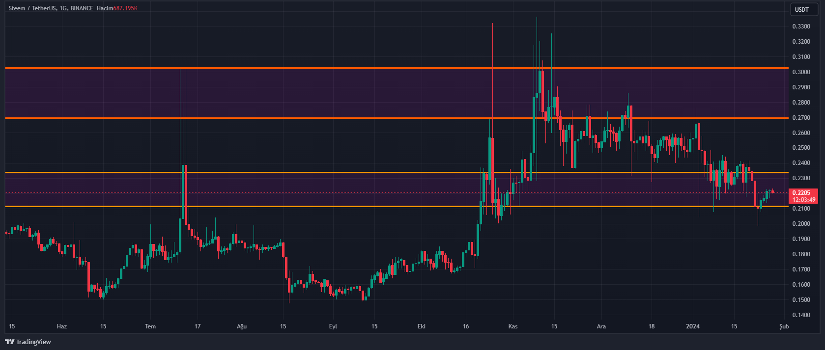 Hello again. I shared a Steem chart about three months ago. A strong resistance area has formed in the Steem price in the 0.18-0.2 price range. The transaction volume on Steem increased significantly in the three-month period. Binance, Bybit, HTX etc. Futures trading started on stock exchanges. We can expect sharp movements in the 0.22-0.32 price range in the coming period. When I trade, I usually follow the chart on the daily time frame. I will share with you the current chart I follow.