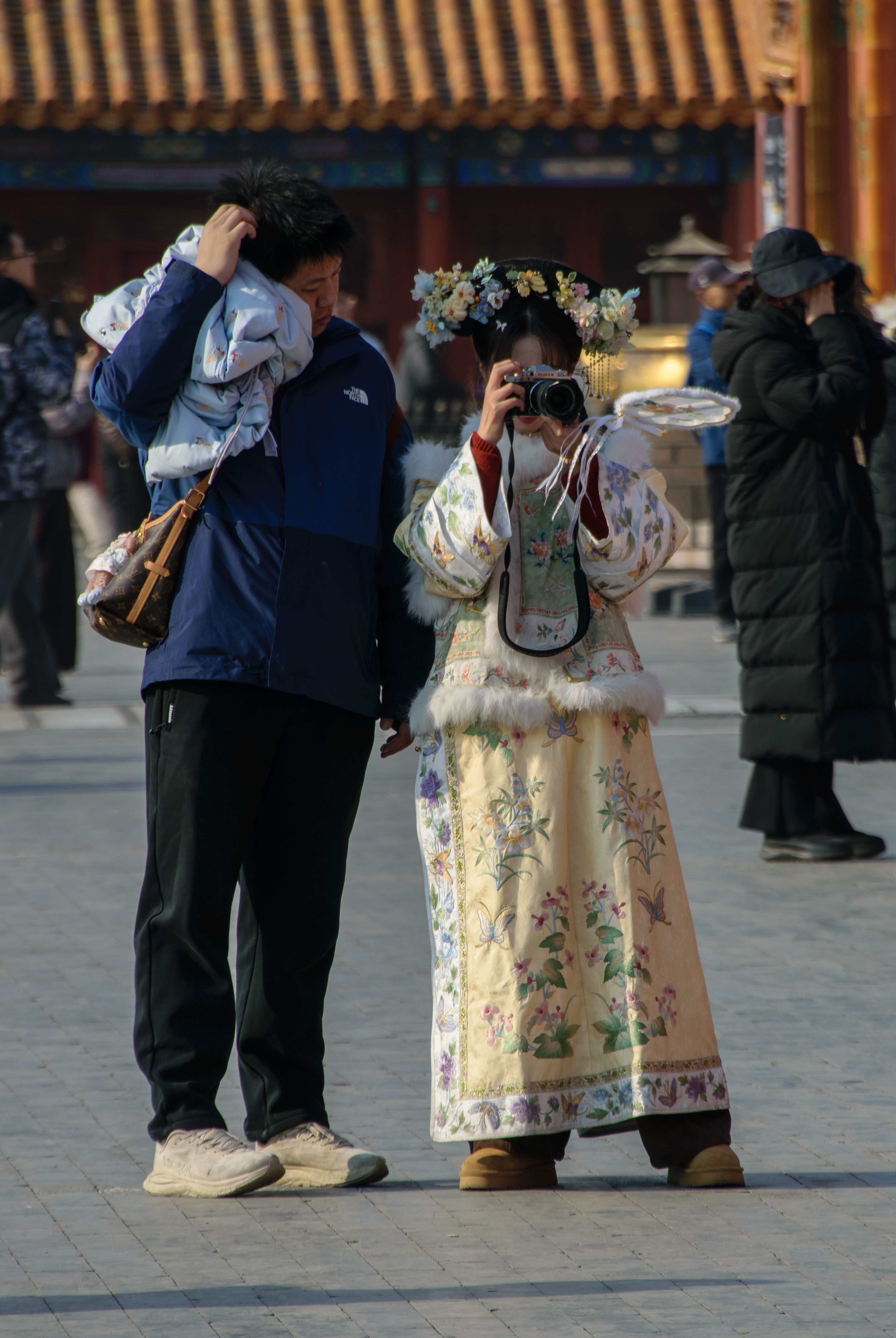 There are a lot of girls dressed in national costumes in the Forbidden City. The guide said that they make streams here. They often do this at the request of their subscribers. They usually have smartphones in their hands or smartphones are on a tripod. But then I saw a girl with a camera. And that caught my attention.