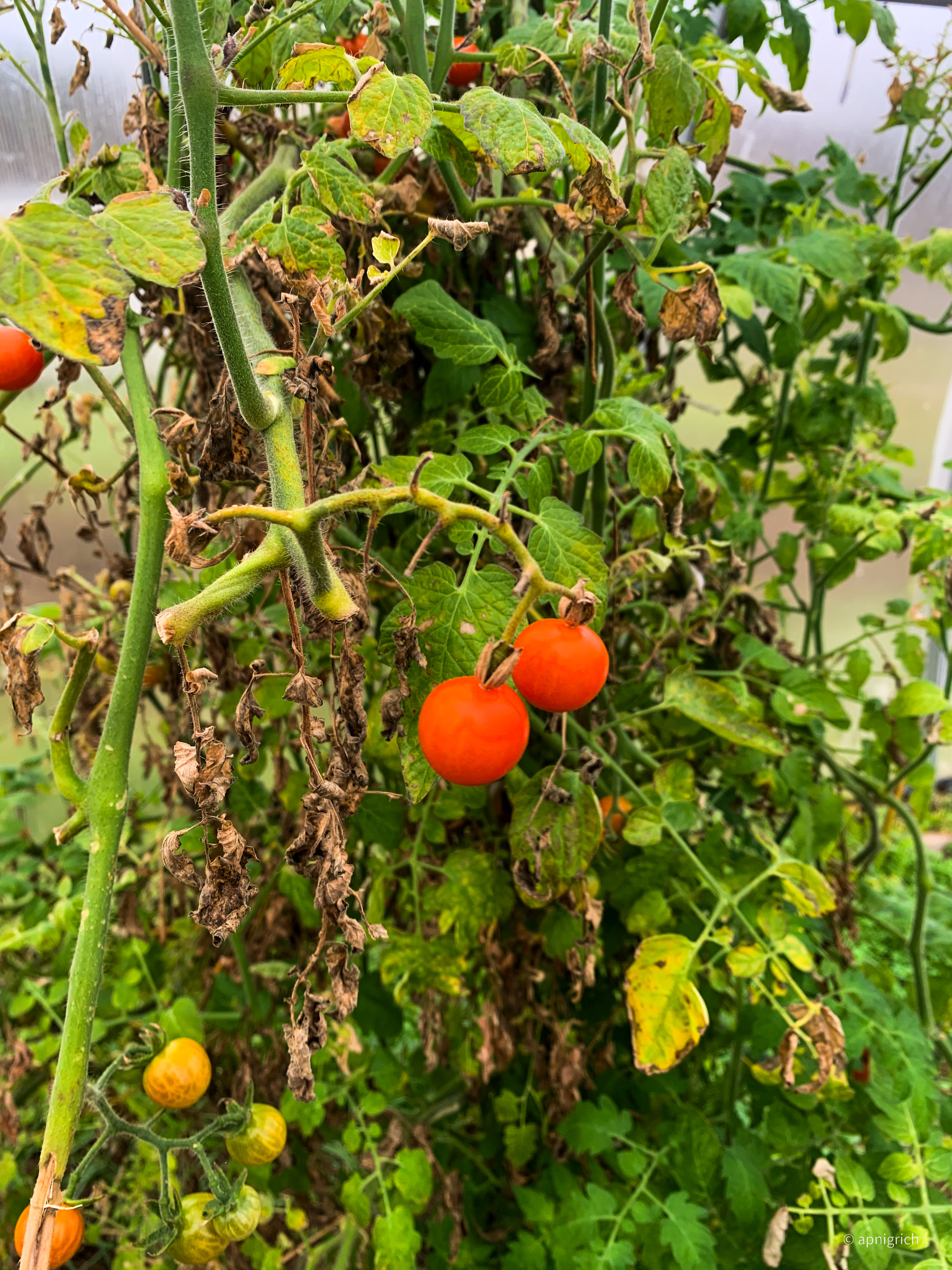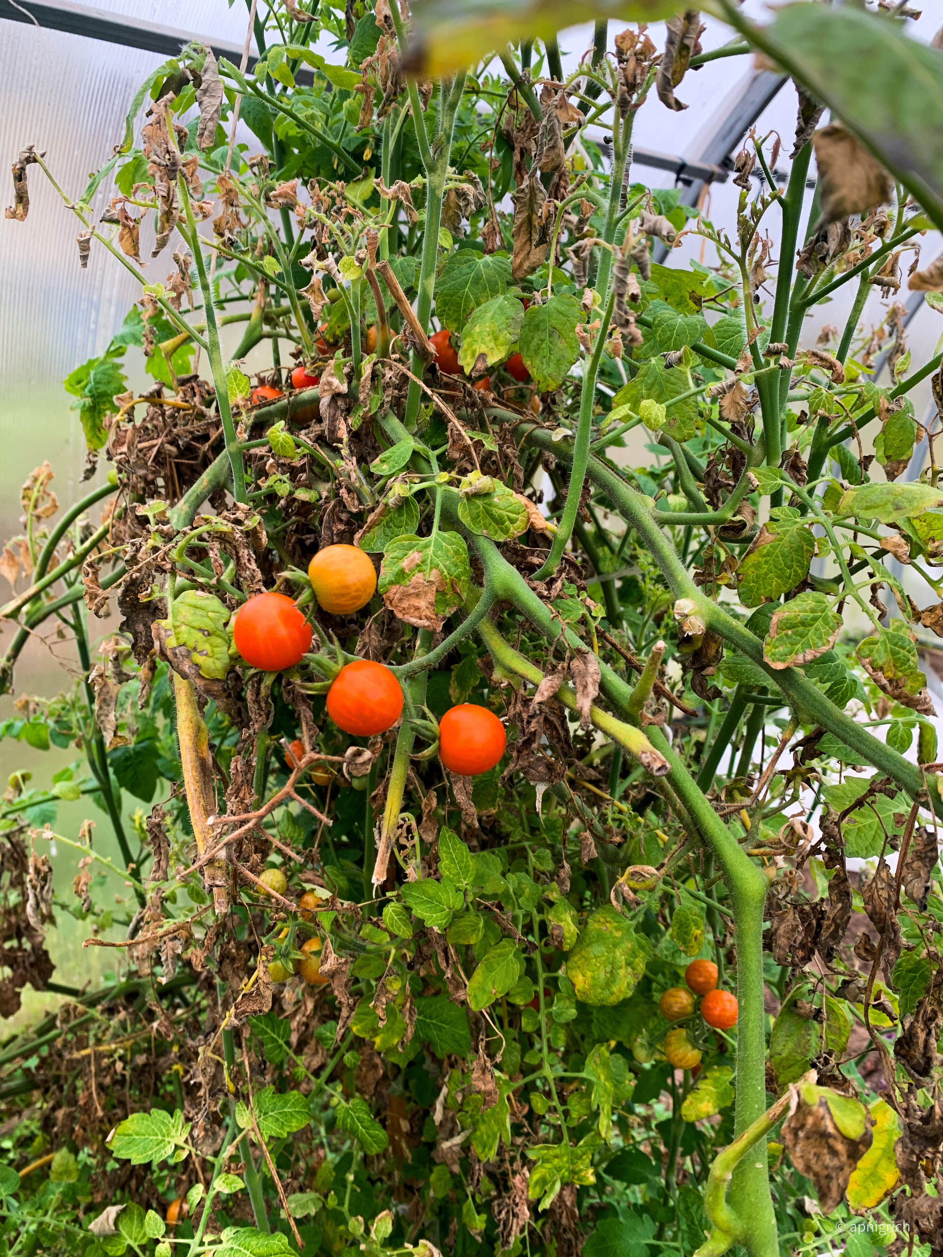 Three days ago, I picked the last cherry tomatoes. I haven't looked into the greenhouse for 2 weeks and was very surprised by these red little tomatoes. But the thermometer had already shown sub-zero temperatures several times at night, but apparently the plant was comfortable in the greenhouse.