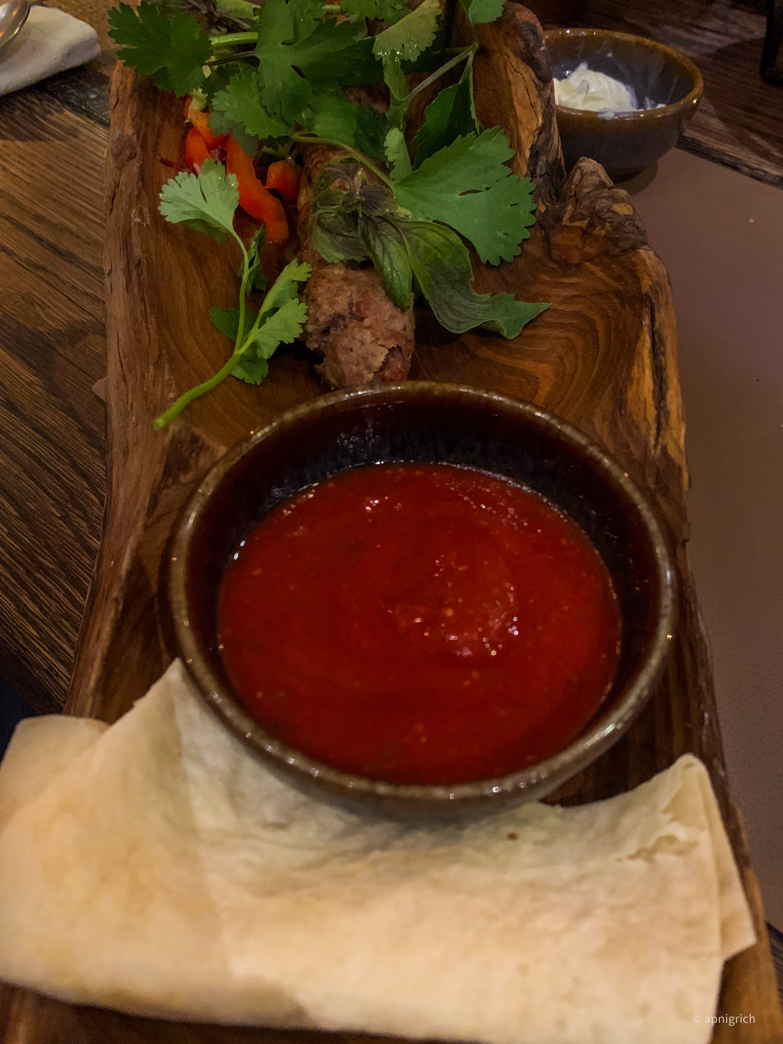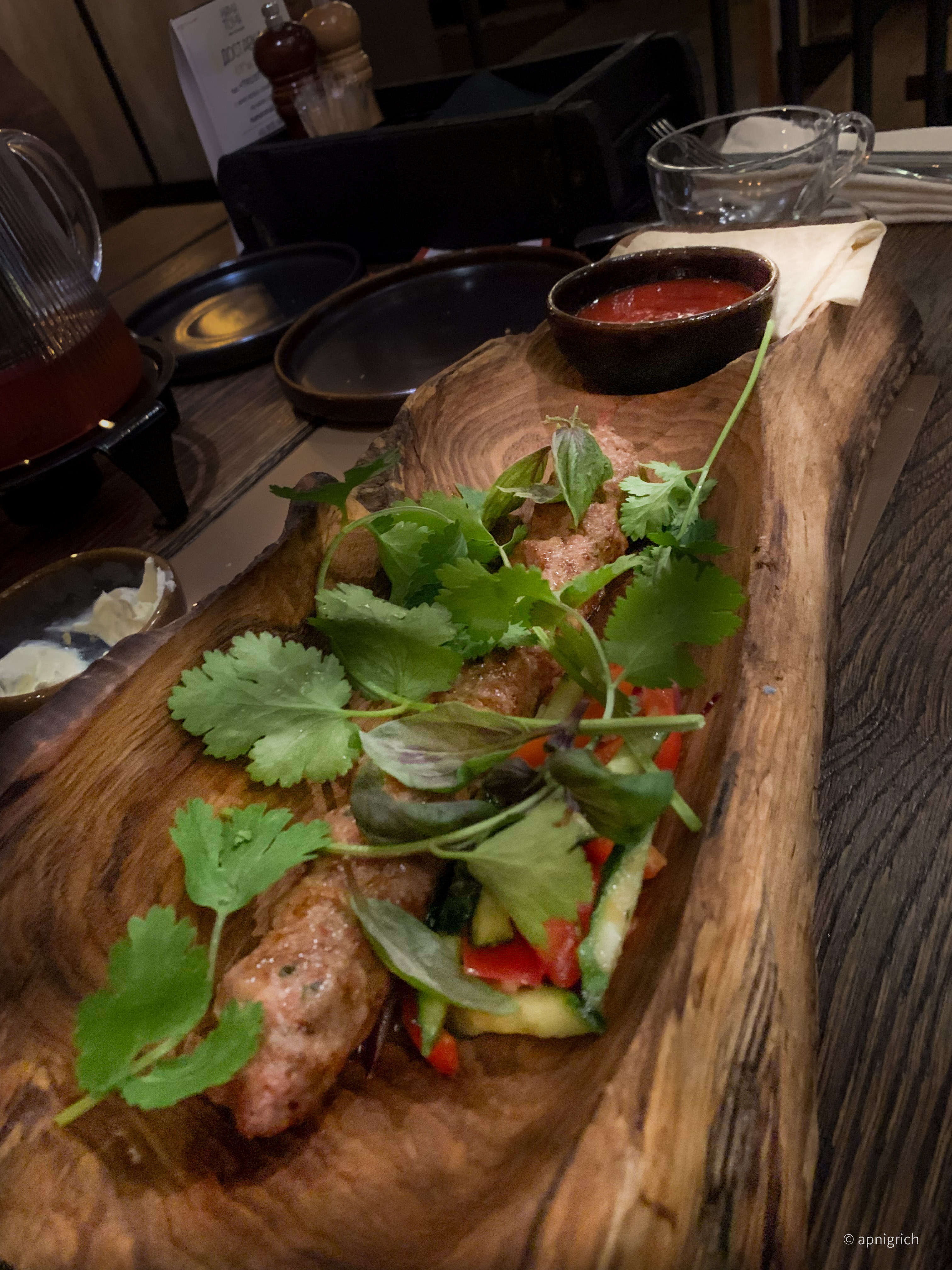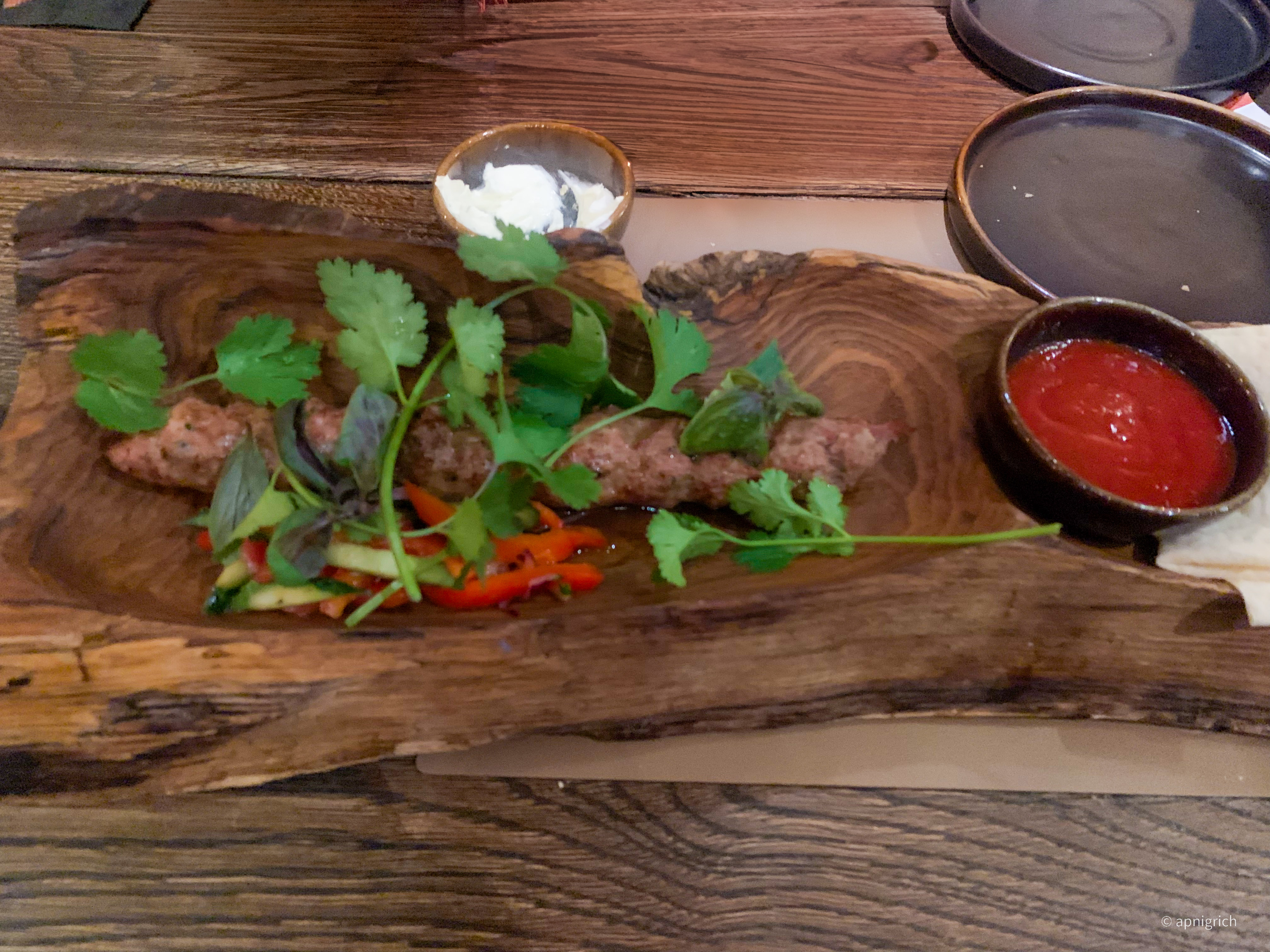 In this restaurant, a special lula kebab is served in a wooden driftwood plate.