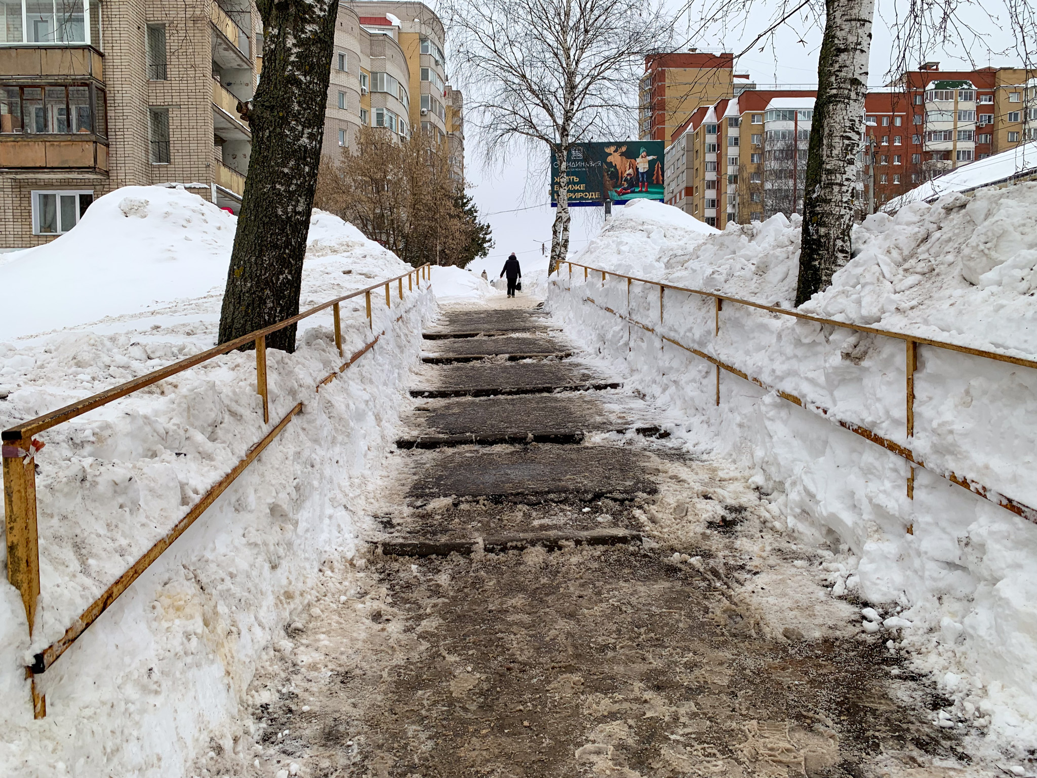 This is how the city of Kirov began to prepare for the arrival of spring. They started clearing the pedestrian paths of snow, which had not been removed since February. Today, I looked at the height of the snow on the paths, which was a dense layer of 30-40 cm in some places.