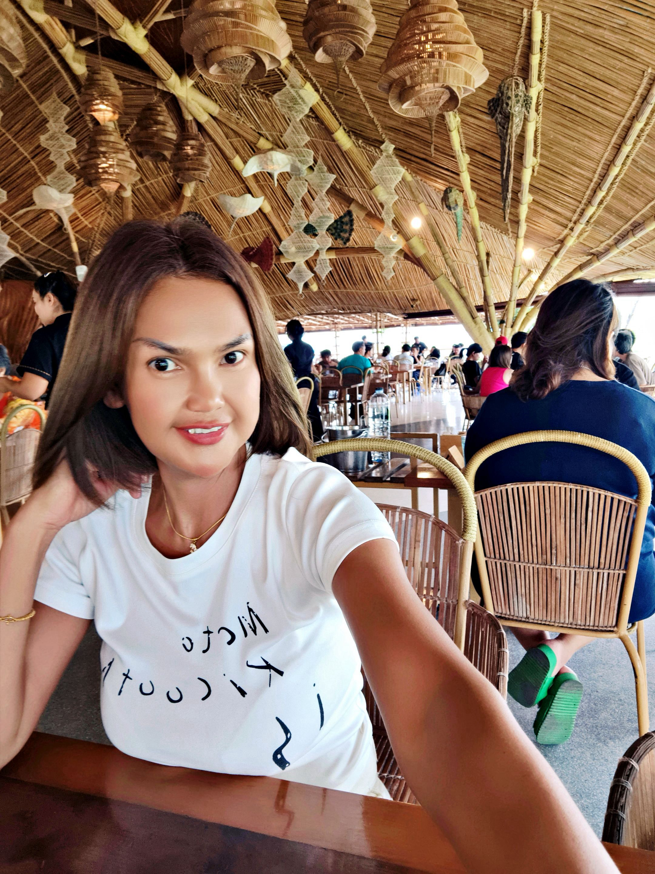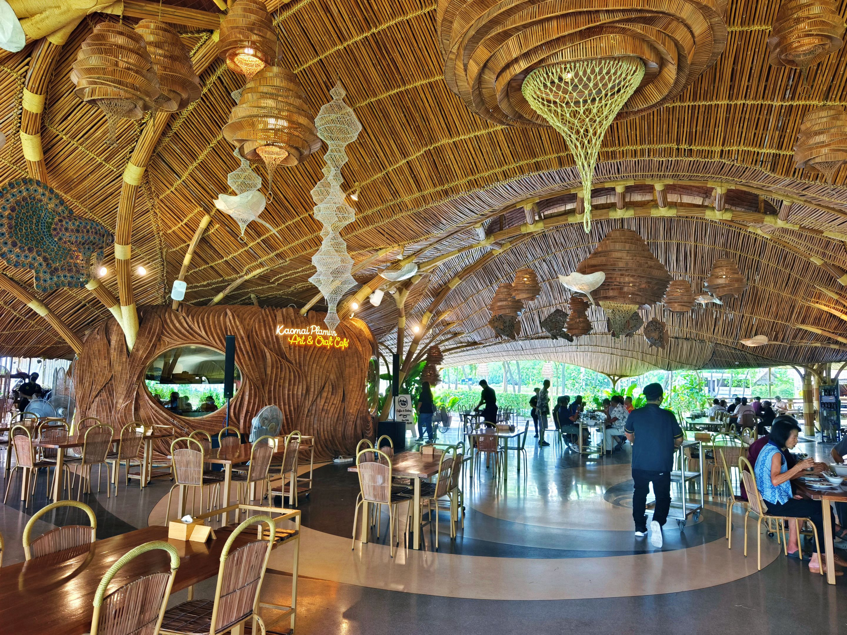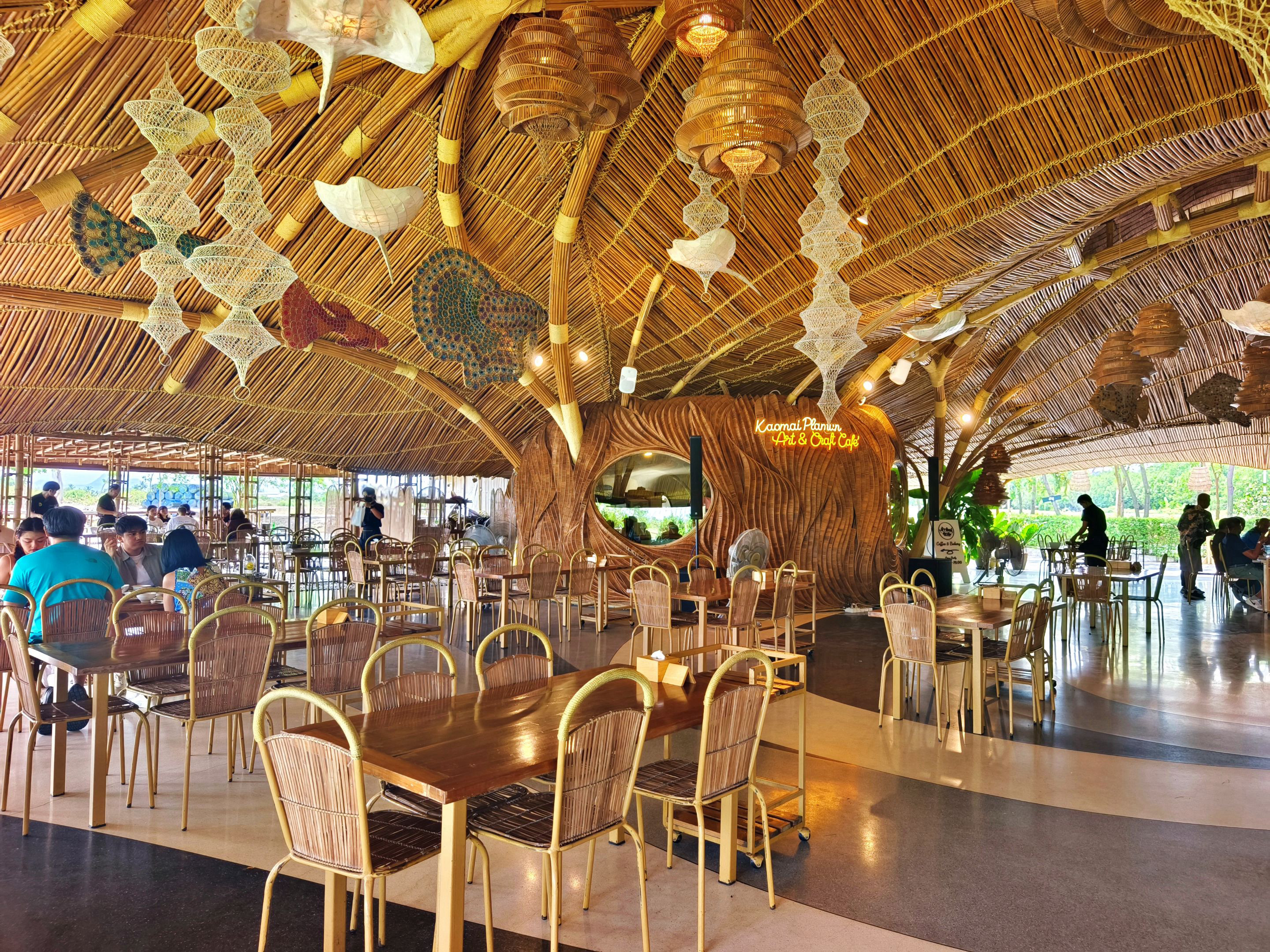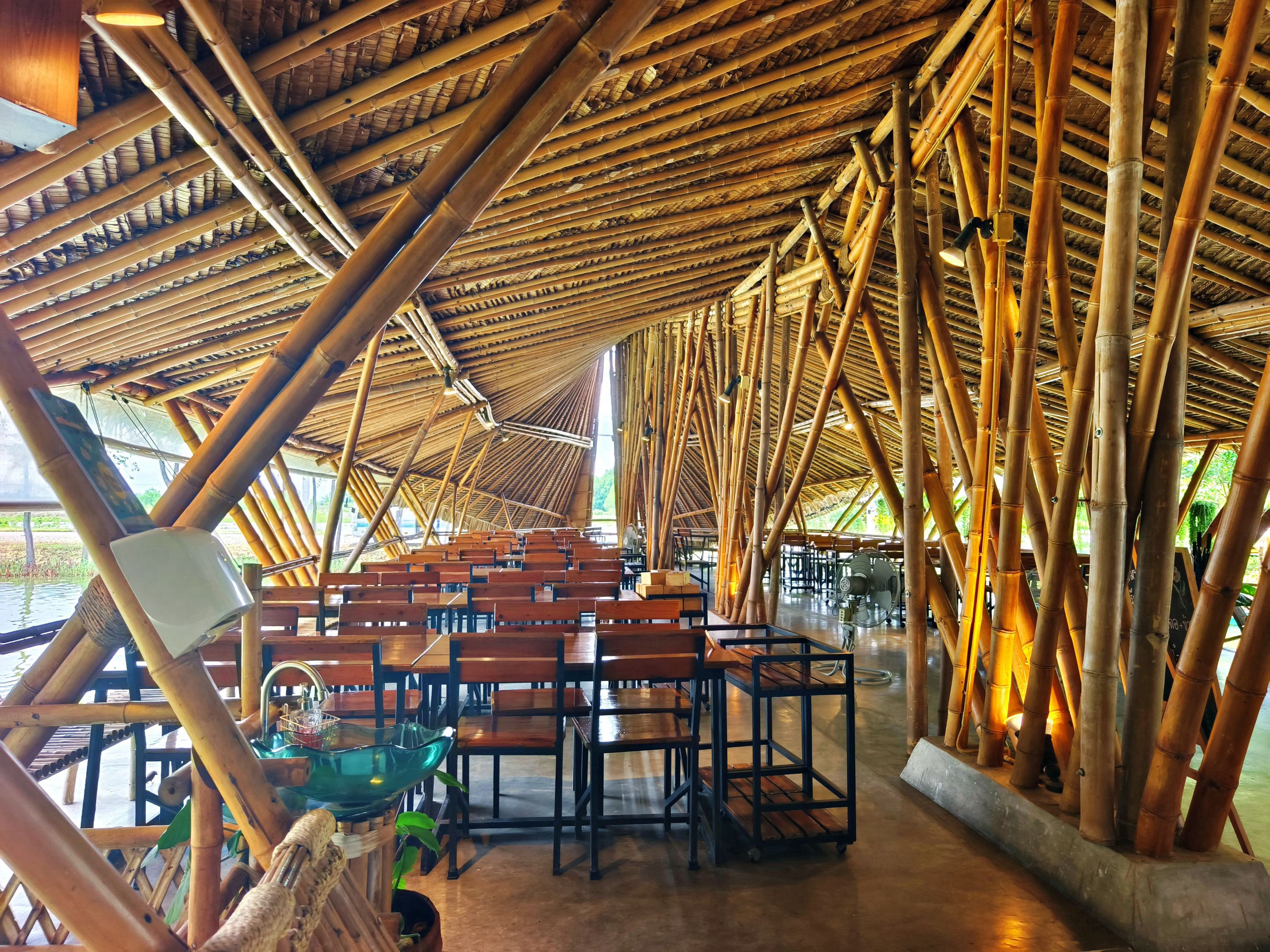 Inside the restaurant, the design is just as impressive. The entire place is built over a large pond, and bamboo is everywhere — from the roof to the furniture. Even the lamps and ceiling decorations, shaped like different aquatic animals, are crafted to match the theme. The chairs are also made from bamboo, adding to the rustic yet creative atmosphere that makes the whole setting so unique. 🪵🐠