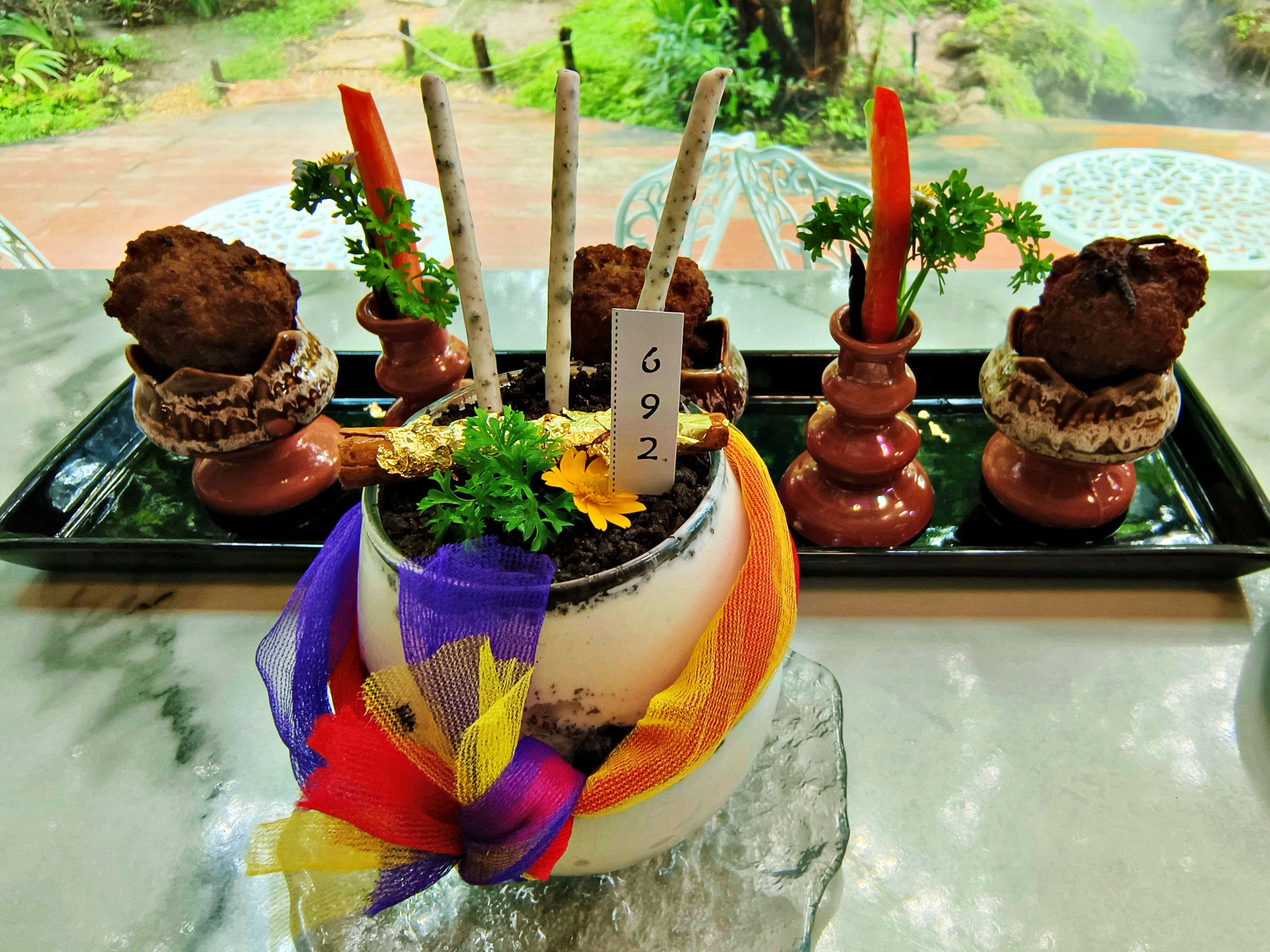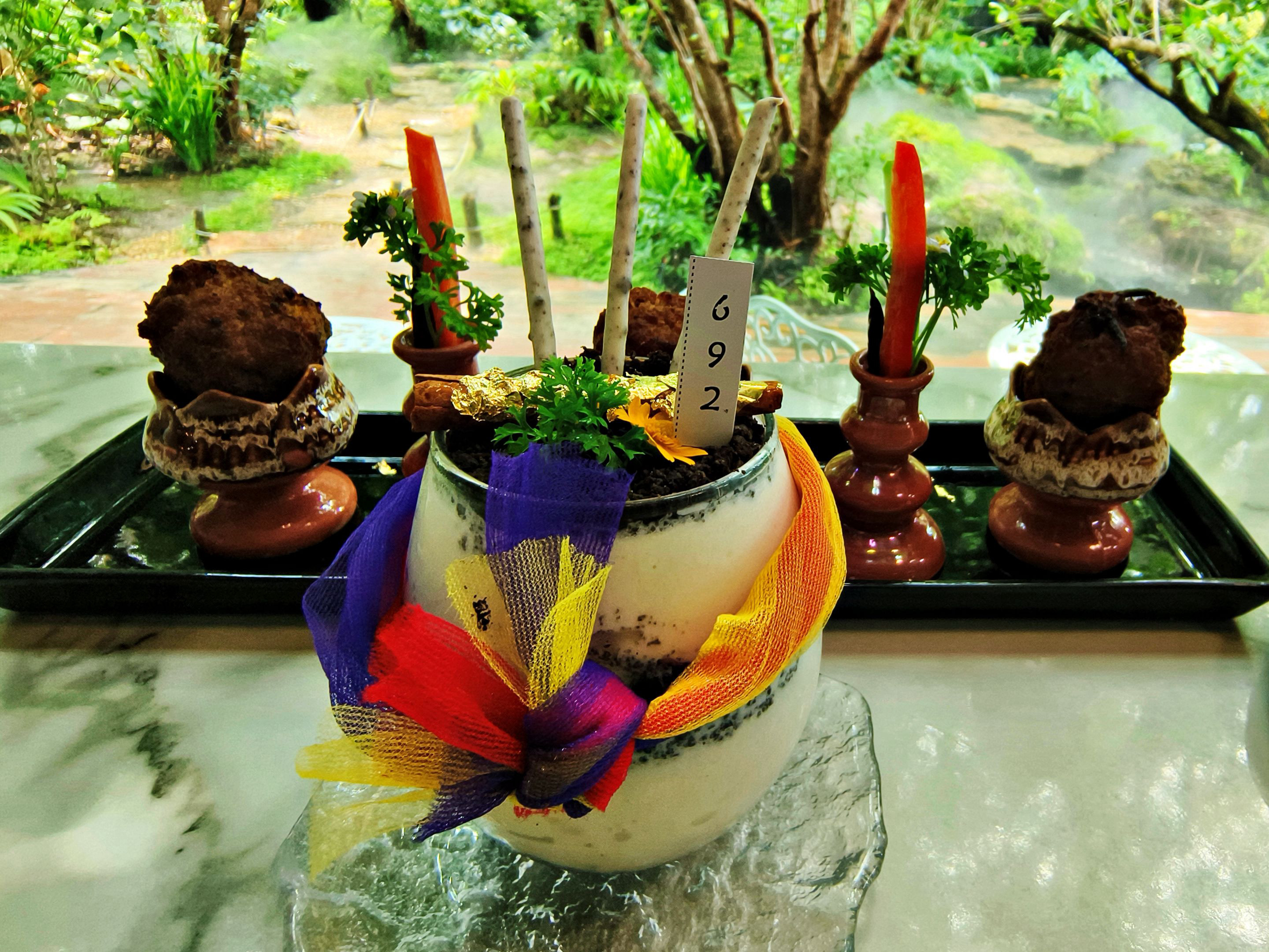 Not long after, the food and drinks I ordered were served—and they turned out to be the signature style of this café. The presentation looked almost like an offering set for the sacred, with the glass wrapped in colorful fabric, giving it the feeling of a drink prepared to honor the gods. The taste was just as impressive—absolutely delicious. 🌈🙏🍹