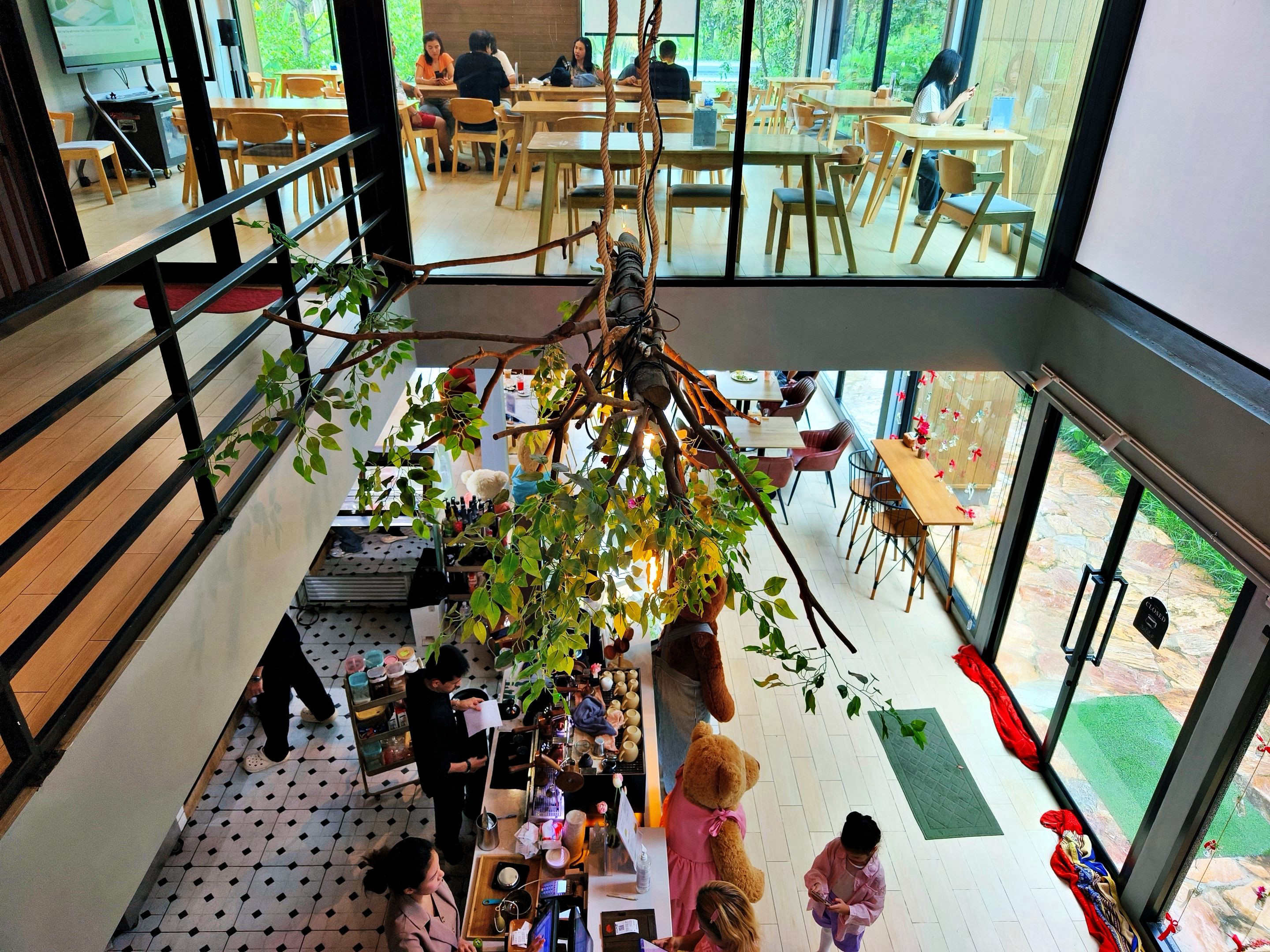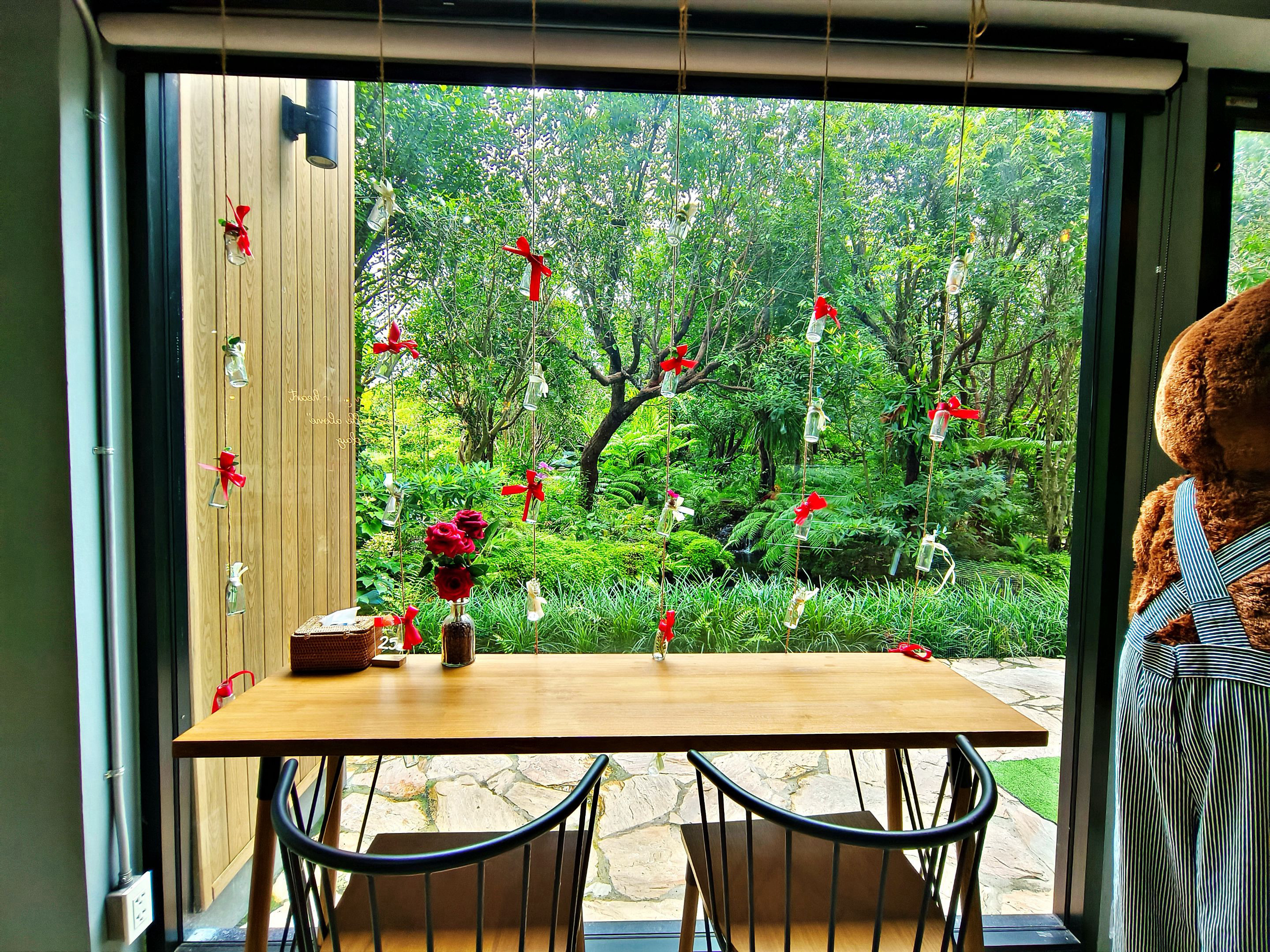 After taking plenty of photos of the outdoor scenery, I decided to move inside and sit by the glass windows, where I could still enjoy the garden view outside. Not long after, the rain began to pour down heavily, creating such a cozy and refreshing atmosphere. 🌧️☕🌿