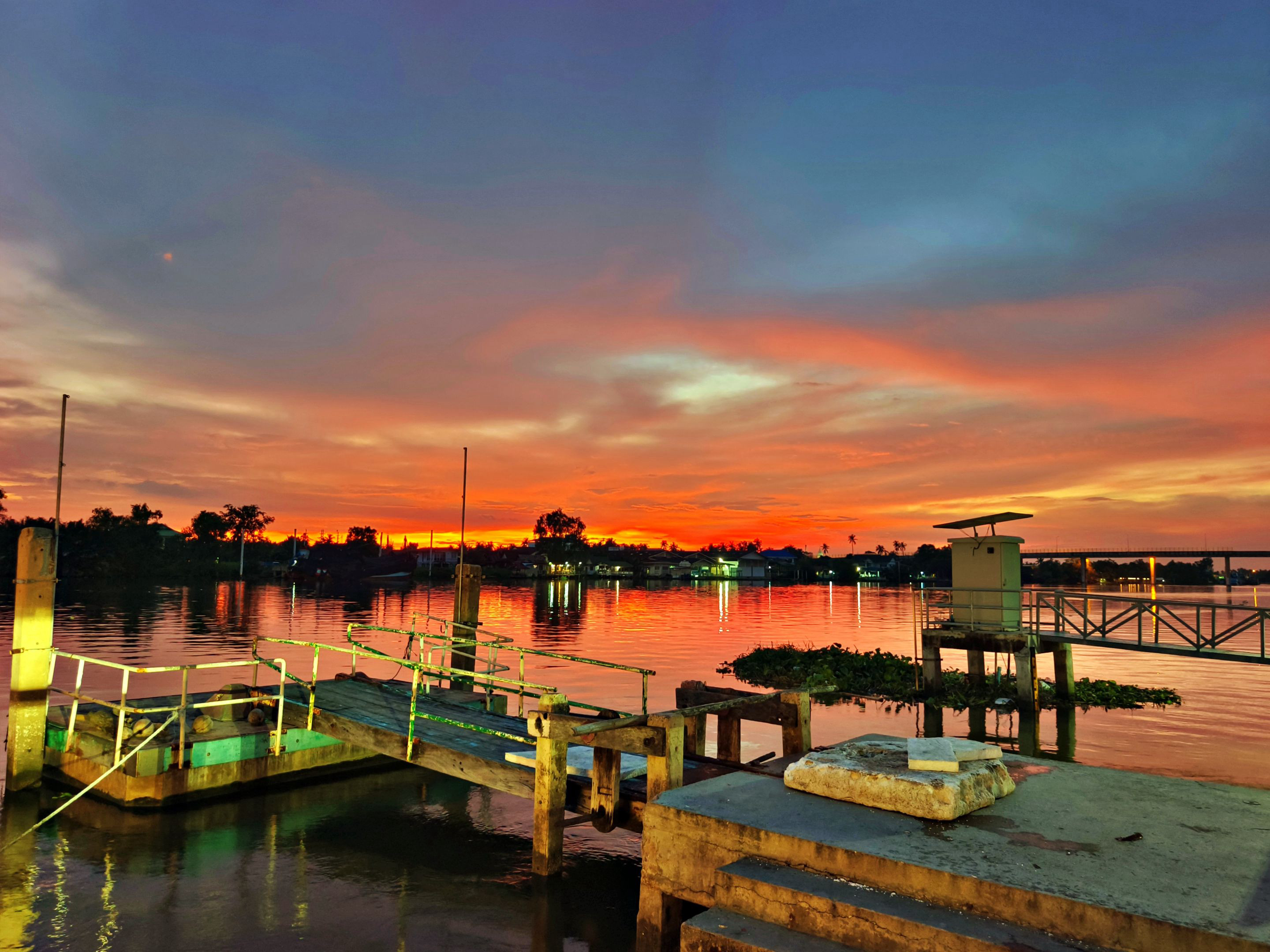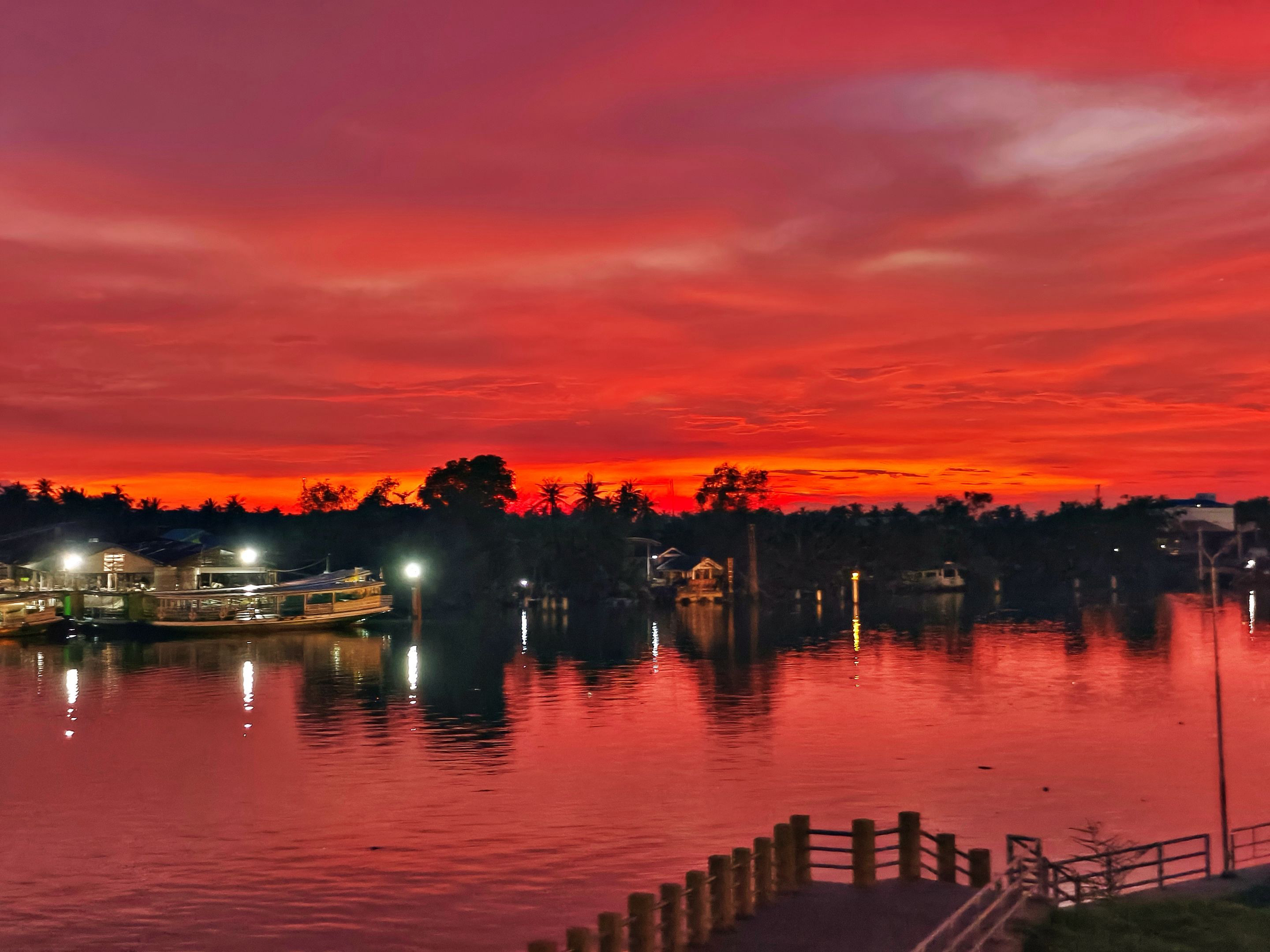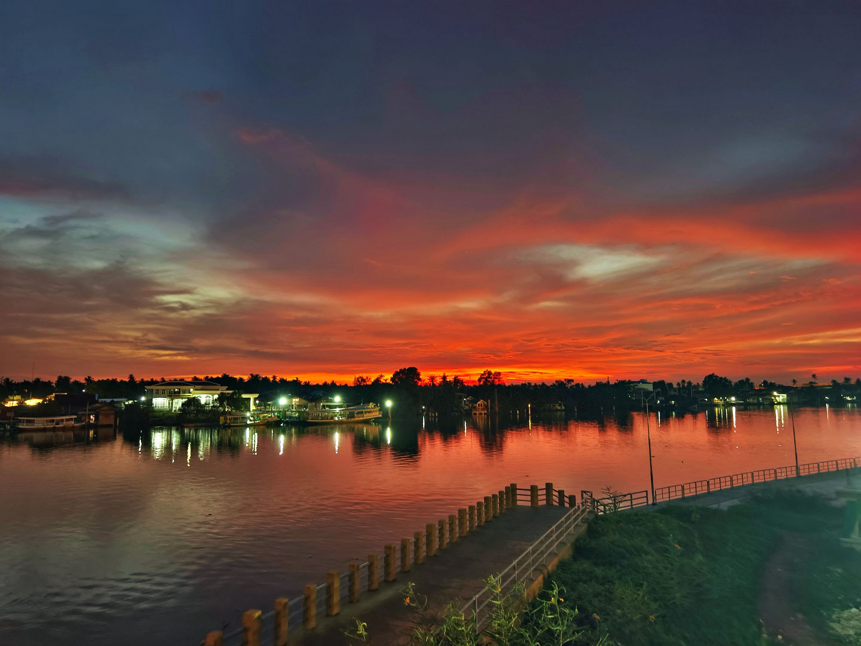 From the higher viewpoint, the colors looked even richer. The lights from the riverside houses began to flicker on, reflecting gently across the water. The combination of the fiery sky and the calm river made the whole atmosphere feel peaceful yet full of life at the same time.