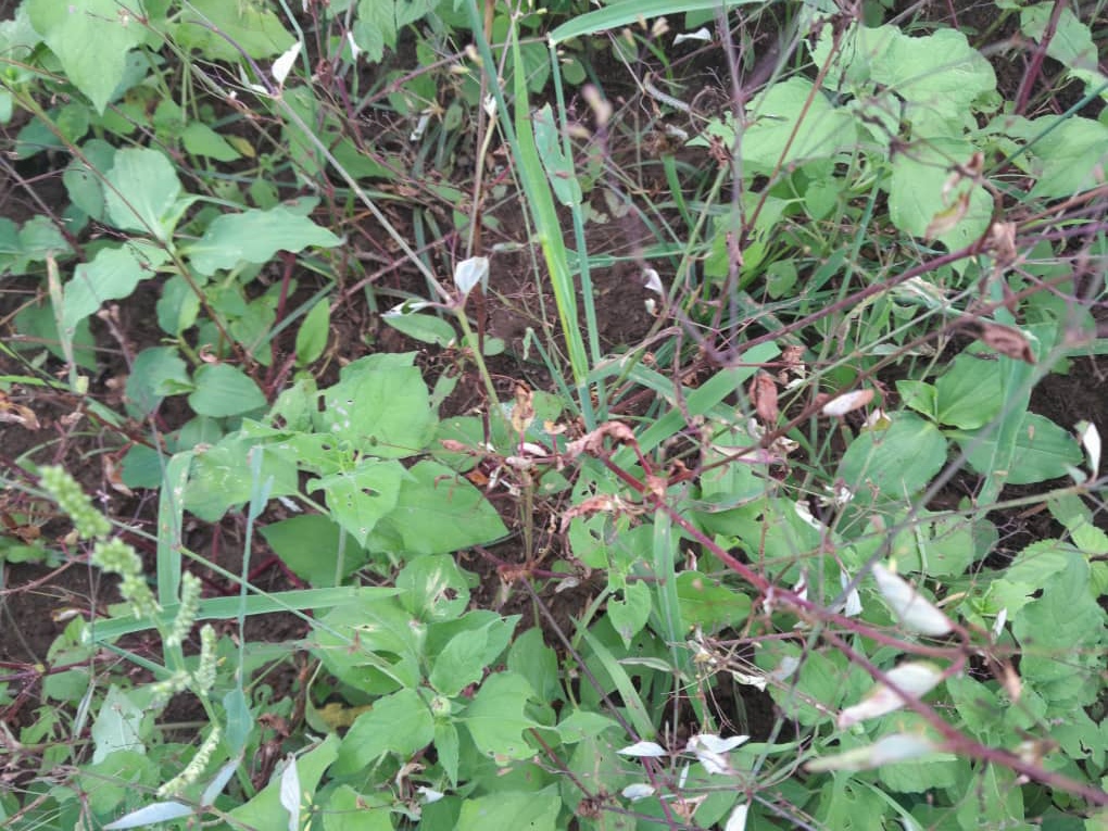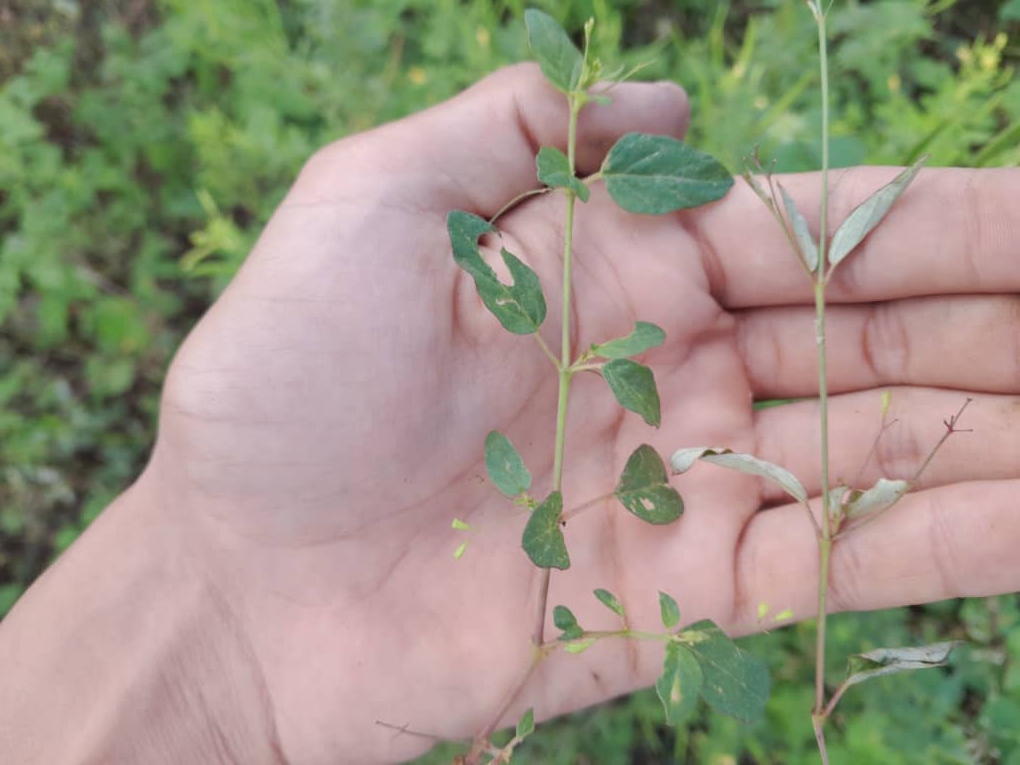 The plant the caterpillars consume is known as tostón . It's a small plant that grows about 30 cm tall, with tiny leaves and small seeds that sometimes stick to clothing. This plant, my friends, is a spring favorite. Here's a sample: I placed a segment of green tostón in my hand, along with one the springs had eaten, so you could appreciate the difference.