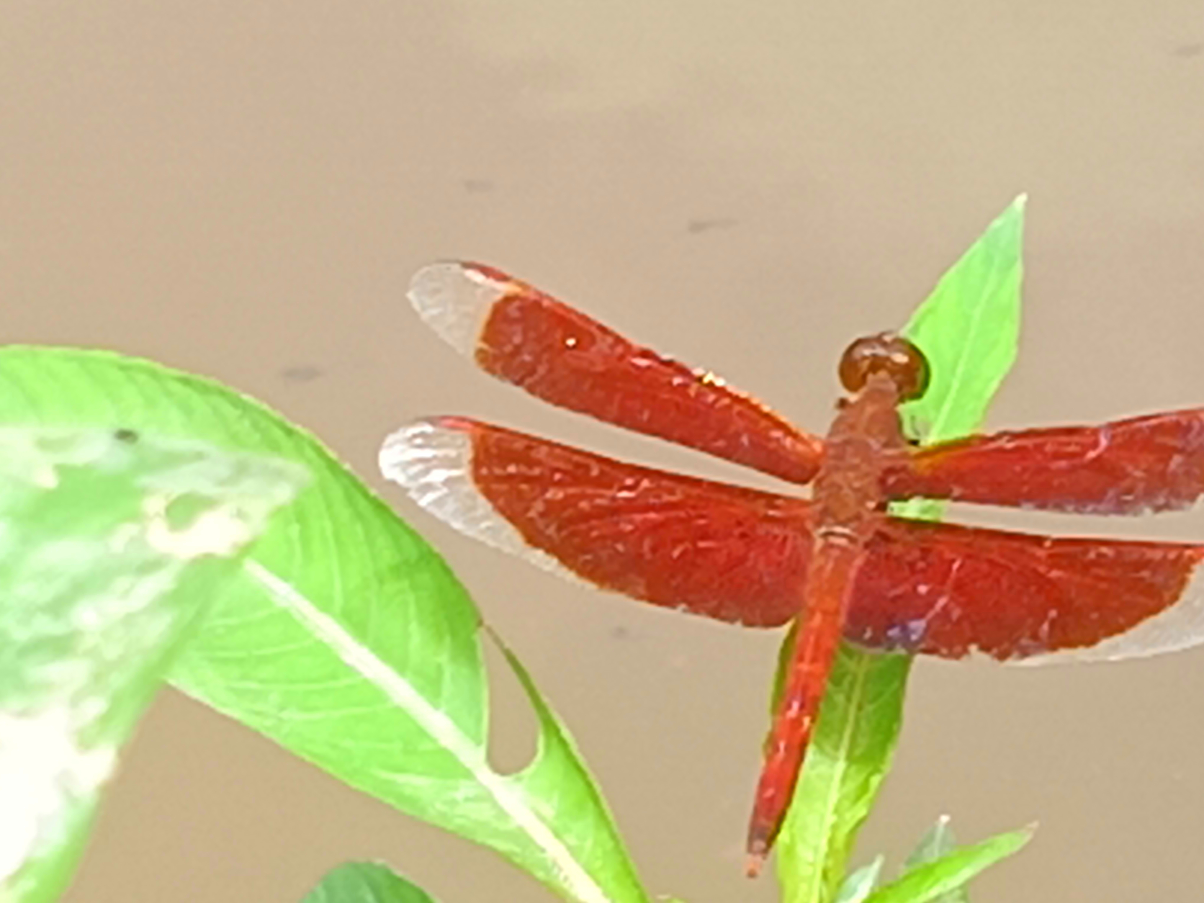 Every corner of nature hides some kind of wonder and sometimes it is the beauty of flowers covered in colors, sometimes it is the soft floating picture of clouds in the sky. Sometimes even a very ordinary moment makes us stop in wonder and just like that, this red dragonfly, whose color, posture and presence are an example of a unique beauty of nature, is the witness of a moment. The red dragonfly seen in the picture has a bright red glow spread all over its body. It seems as if a small flame of fire is resting on a green leaf. Dragonflies are usually very fast and standing still is a kind of art for them, but the red dragonfly in this picture seems to be completely calm and silent and sits on the tip of a leaf with its wings spread out and arranged. Half of the wings are transparent and the rest are dark red.