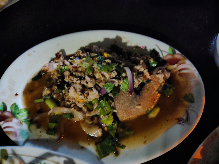 จานถัดมา เราพุ่งเข้าใส่ ลาบหมู จานโต! นี่ไม่ใช่แค่สลัดธรรมดา แต่มันคือปาร์ตี้ในปากของคุณ! หมูสับรวนสุก คลุกเคล้ากับส่วนผสมที่สดชื่นอย่างใบสะระแหน่ หอมแดงรสจัดจ้าน น้ำมะนาวเปรี้ยวจี๊ด และพริกป่นที่ใส่มาแบบไม่ยั้ง อาวุธลับของจานนี้ก็คือ ข้าวคั่ว – ที่ช่วยเพิ่มกลิ่นหอมคล้ายถั่วและเนื้อสัมผัสกรุบกรอบได้อย่างไม่น่าเชื่อ มันคือการระเบิดของรสชาติที่ทั้งสดชื่น เผ็ดร้อน และกลมกล่อม ที่ให้ความรู้สึกเหมือนทานอาหารพื้นบ้านแต่ก็แฝงไปด้วยความปราณีตในเวลาเดียวกัน