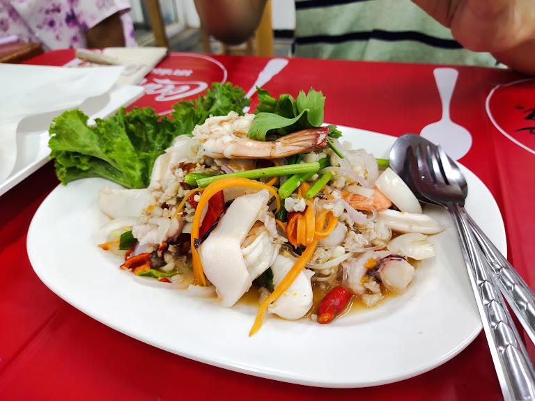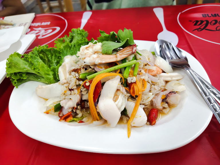 เริ่มกันที่เมนูแรก ยำทะเล! โอ้โห...คุณพระช่วย! ลองจินตนาการภาพภูเขาไฟทะเลเดือดปุดๆ ที่อัดแน่นไปด้วยกุ้ง ปลาหมึก และหอยแมลงภู่สดๆ คลุกเคล้ากับน้ำยำรสแซ่บจี๊ดจ๊าด เปรี้ยว เผ็ด หอมกลิ่นสมุนไพร ทุกคำที่กัดเข้าไปเหมือนกับการเดินไต่เชือกบนความเผ็ดร้อนและความสดชื่น – มันปลุกทุกต่อมรับรสให้ตื่นขึ้นมาร้องเพลงเลยครับ!