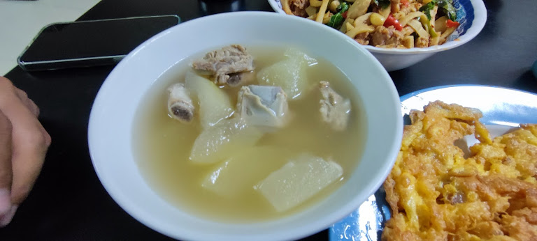 พอเจอความเผ็ดเข้าไป เราก็ต้องหาที่พักใจ... และนี่คือ "ต้มฟักกระดูกหมู" น้ำซุปสีทองใสปิ๊งที่ผ่านการเคี่ยวจนหวานหอม กระดูกหมูนี่คือ เปื่อยจนละลายในปาก ส่วนฟักก็นุ่มใสราวกับวุ้น เป็นเมนูที่ช่วยรีเฟรชลิ้นและทำให้หัวใจอบอุ่นสุดๆ ไปเลยครับ!