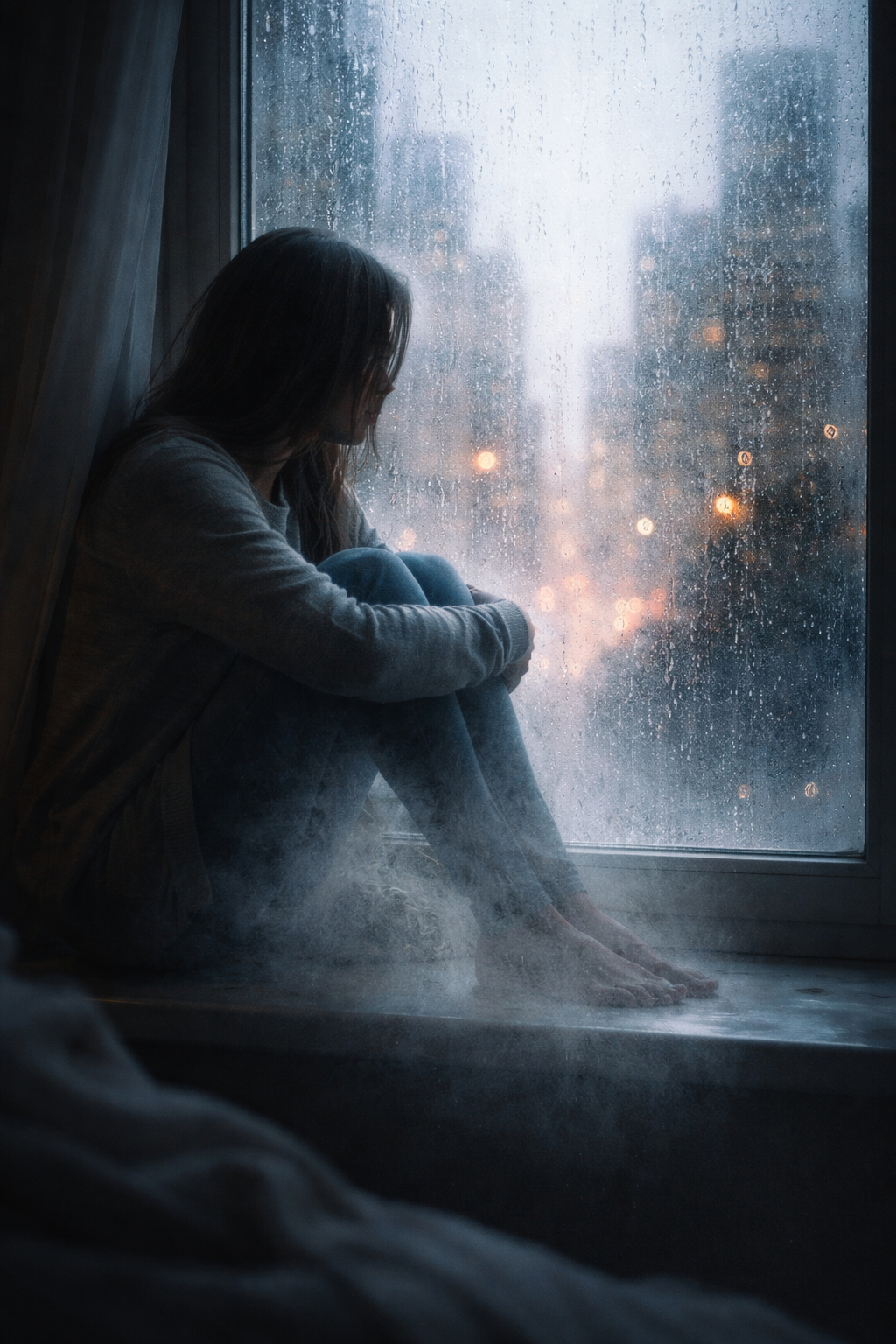 It started raining softly on the window. It was just like the tiny fingers asking to come inside. A girl was sitting by the glass window. She was watching the blurry lights of the city from the far away. The cars were moving and the people were laughing. The life was going on for all the people but not for her. She was feeling herself alone and invisible. No one was noticing her.