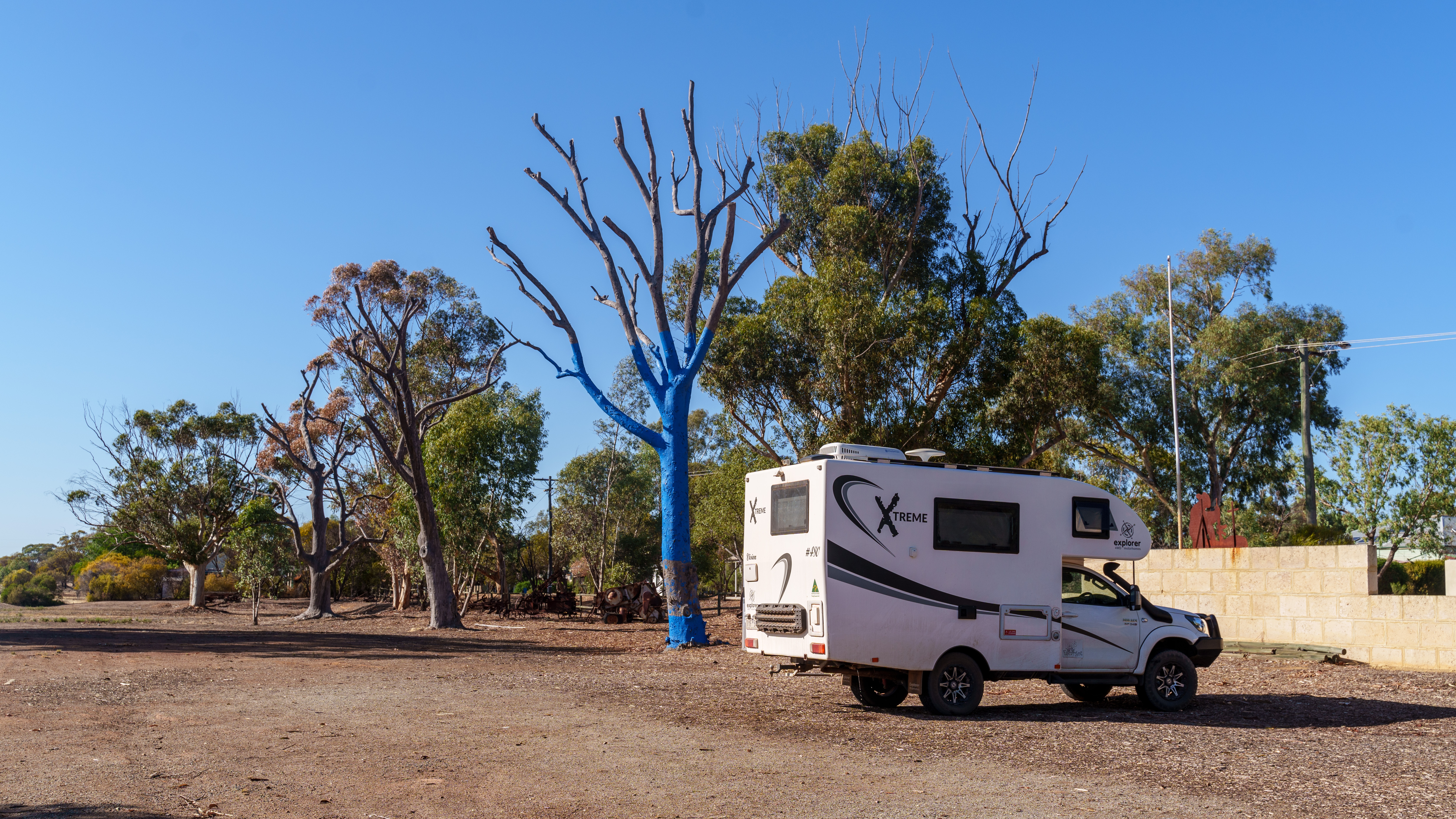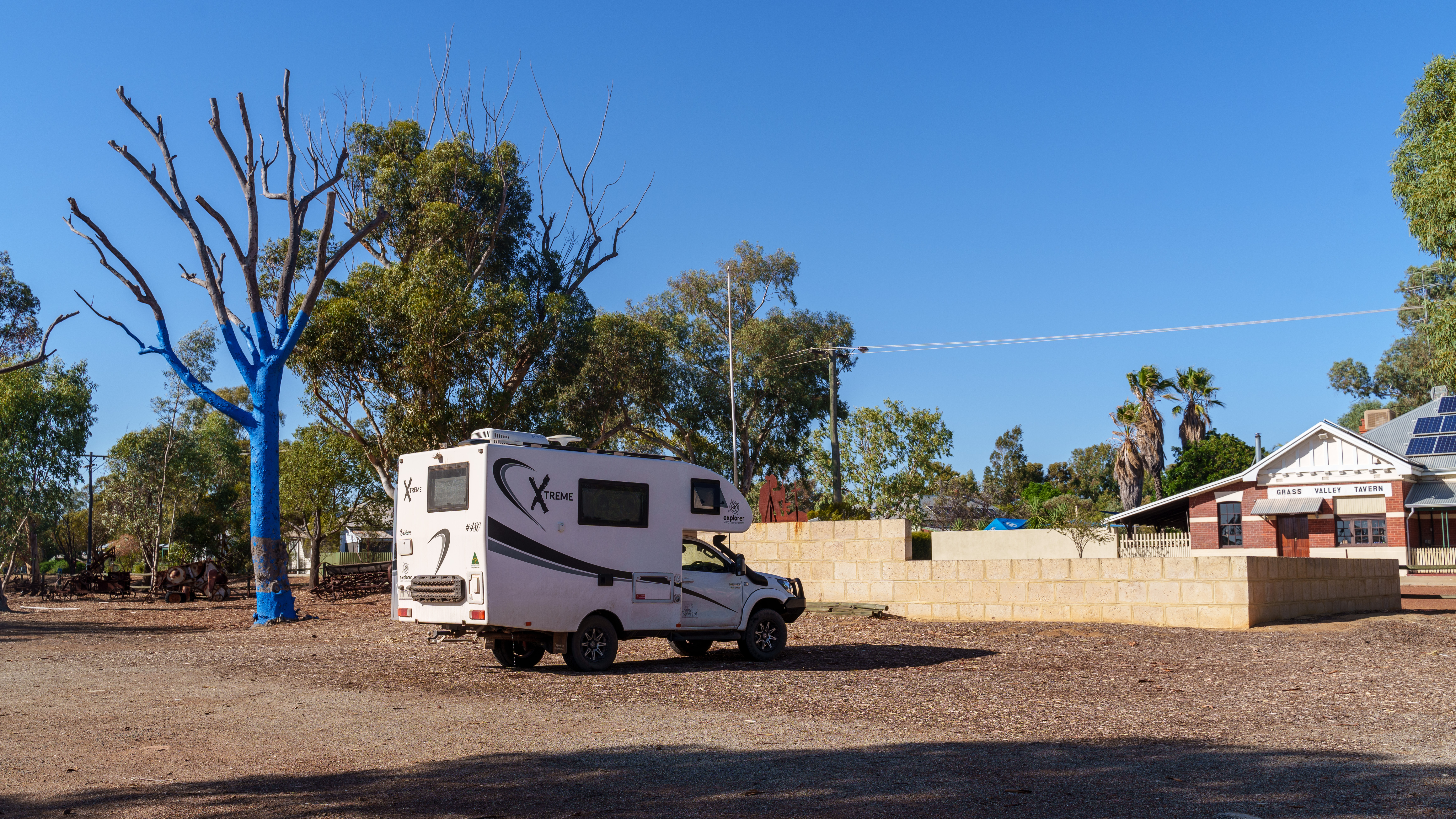 Camped outside the Grass Valley Tavern near Northam in southern Western Australia and next to a tree which was painted blue. There are many trees painted like this around Australia highlighting awareness for Men's mental health. We could also duck across the road for a quick drink from our camp site.