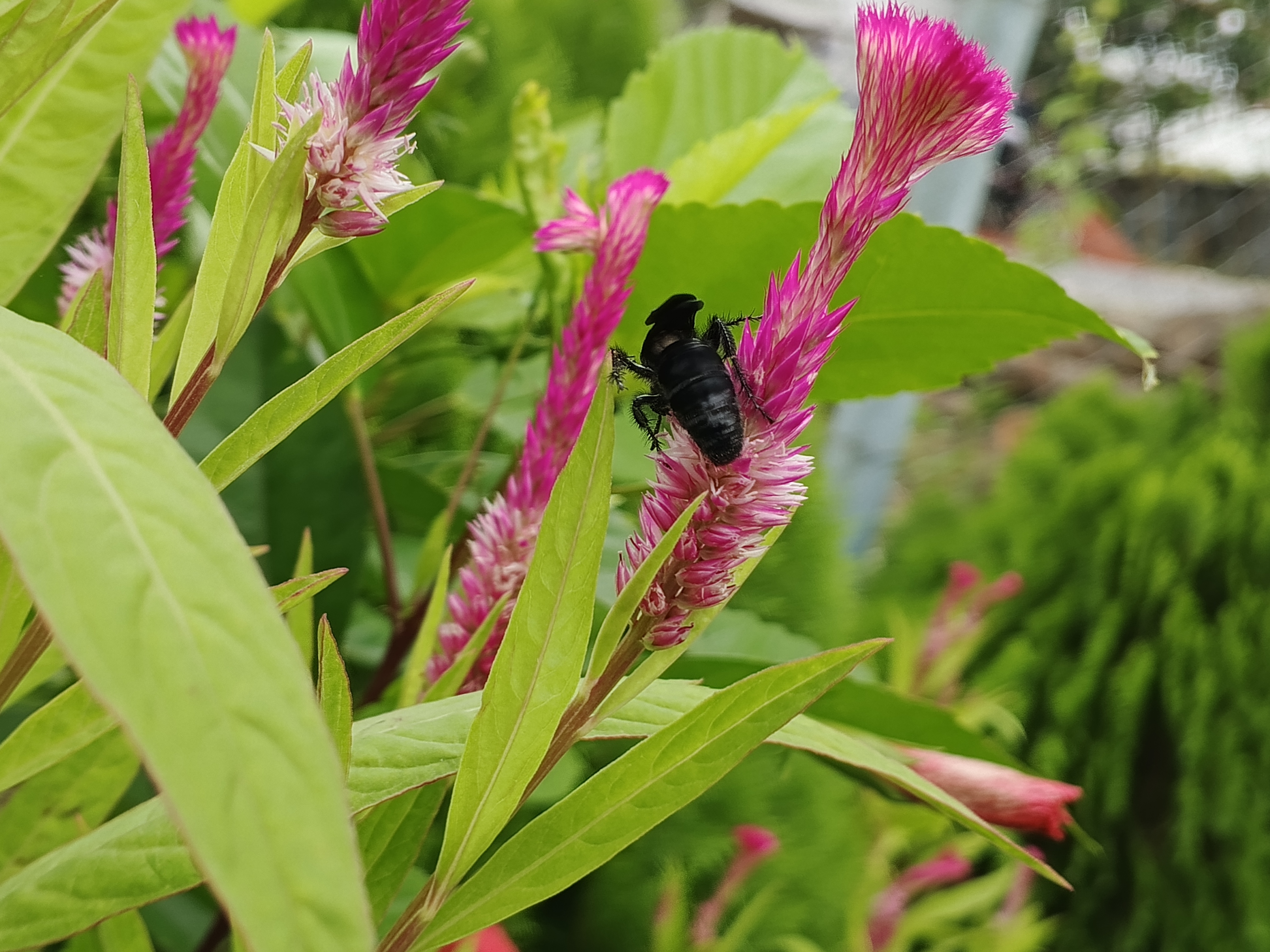 If you look at this photograph, you can see a very beautiful flower. And a bee is sitting on that flower. Actually, these bees fly to different flowers and store honey. I like the moment of them storing honey like that very much, that's why I took this photo.