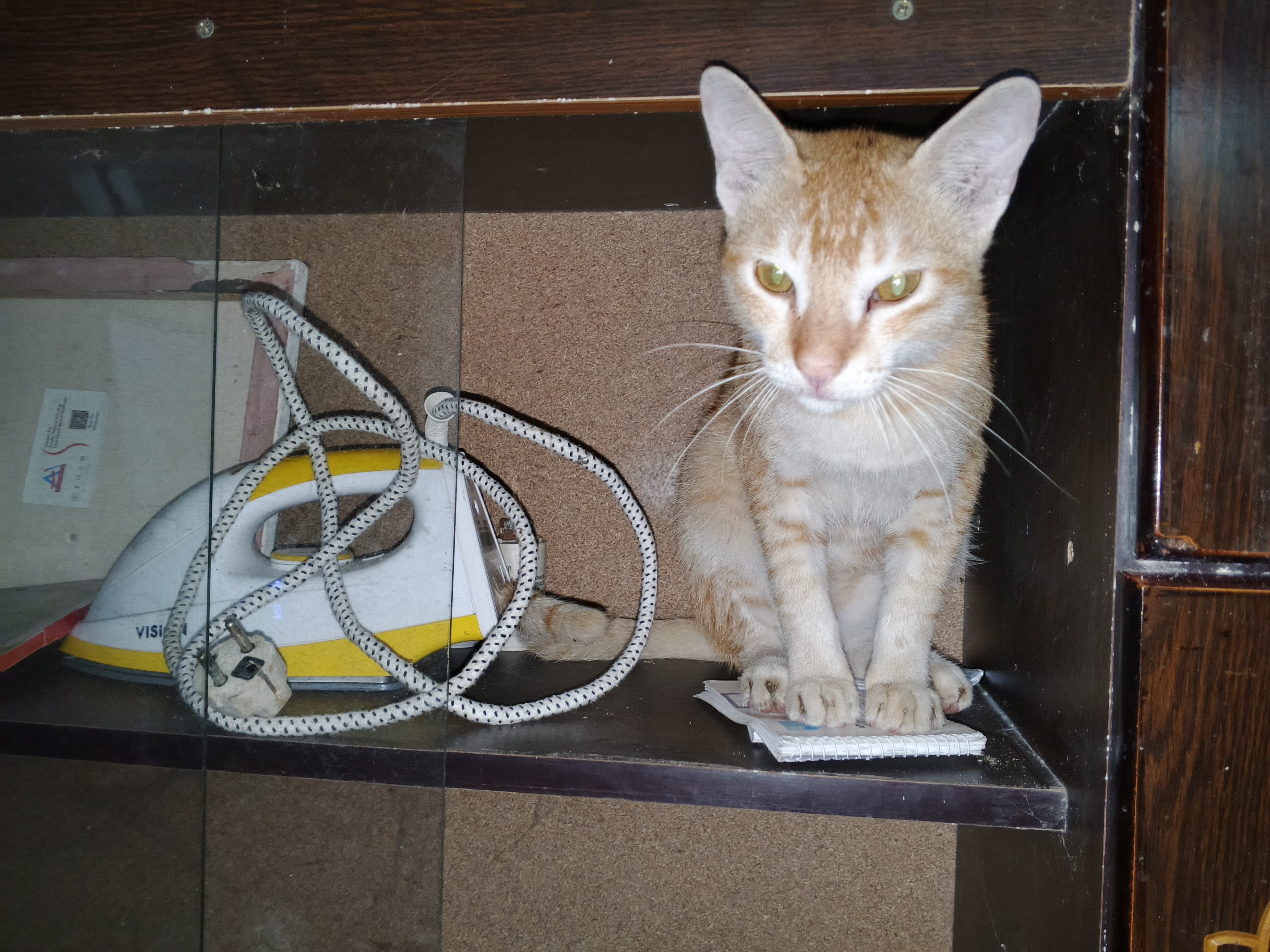 If you look at this photography, you will see a wonderful scene. Many people arrange doll-like cats in mickey mouse shells or in showcases. But here, a cat is standing in a showcase next to a clothes calendaring machine. I liked the moment of its position so much that I immediately came to take the photo. However, when I was taking the photo of the girl, the cat was sitting beautifully as if it wanted to take the photo itself.