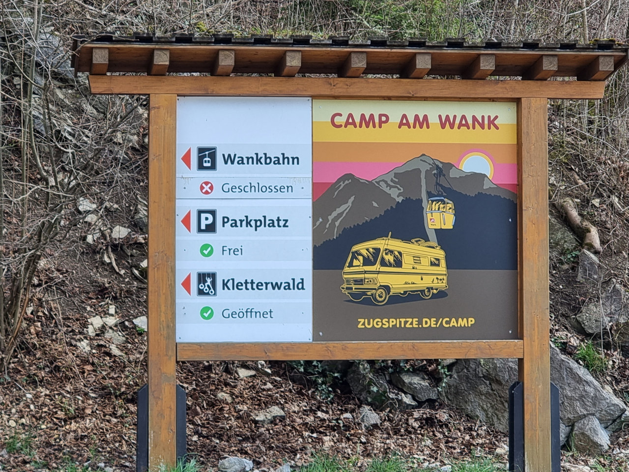 Zum Ostern haben wir uns ich und meine Frau an die bayerischen Alpen verschlagen, wir sind jetzt hier unterhalb der Zugspitze im Bereich Garmisch-Partenkirchen und der Stellplatz, auf dem jetzt wir Ostern verbringen, das ist der Camp am Wank, Wank ist der Hausberg Panoramaberg von Garmisch-Partenkirchen und die haben hier einen riesengroßen Wohnmobilstellplatz genau an der Talstation der Wankbahn man erreicht dann diesen Stellplatz ganz einfach aus Garmisch-Partenkirchen muss man bloß der Beschilderung Wohnmobilstellplatz folgen da geht's immer links hoch.