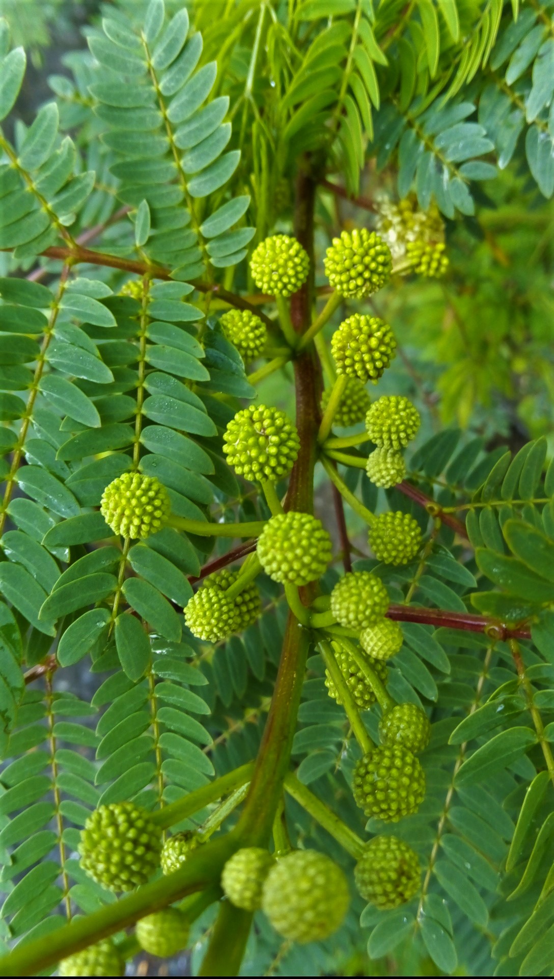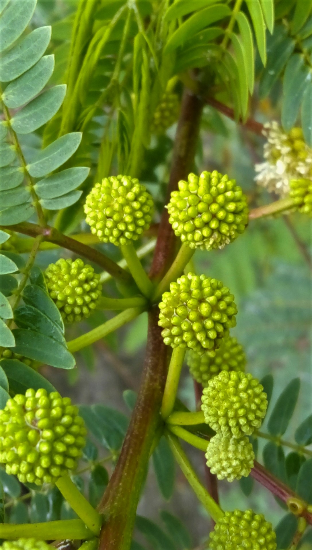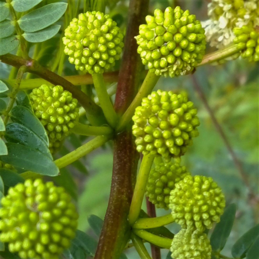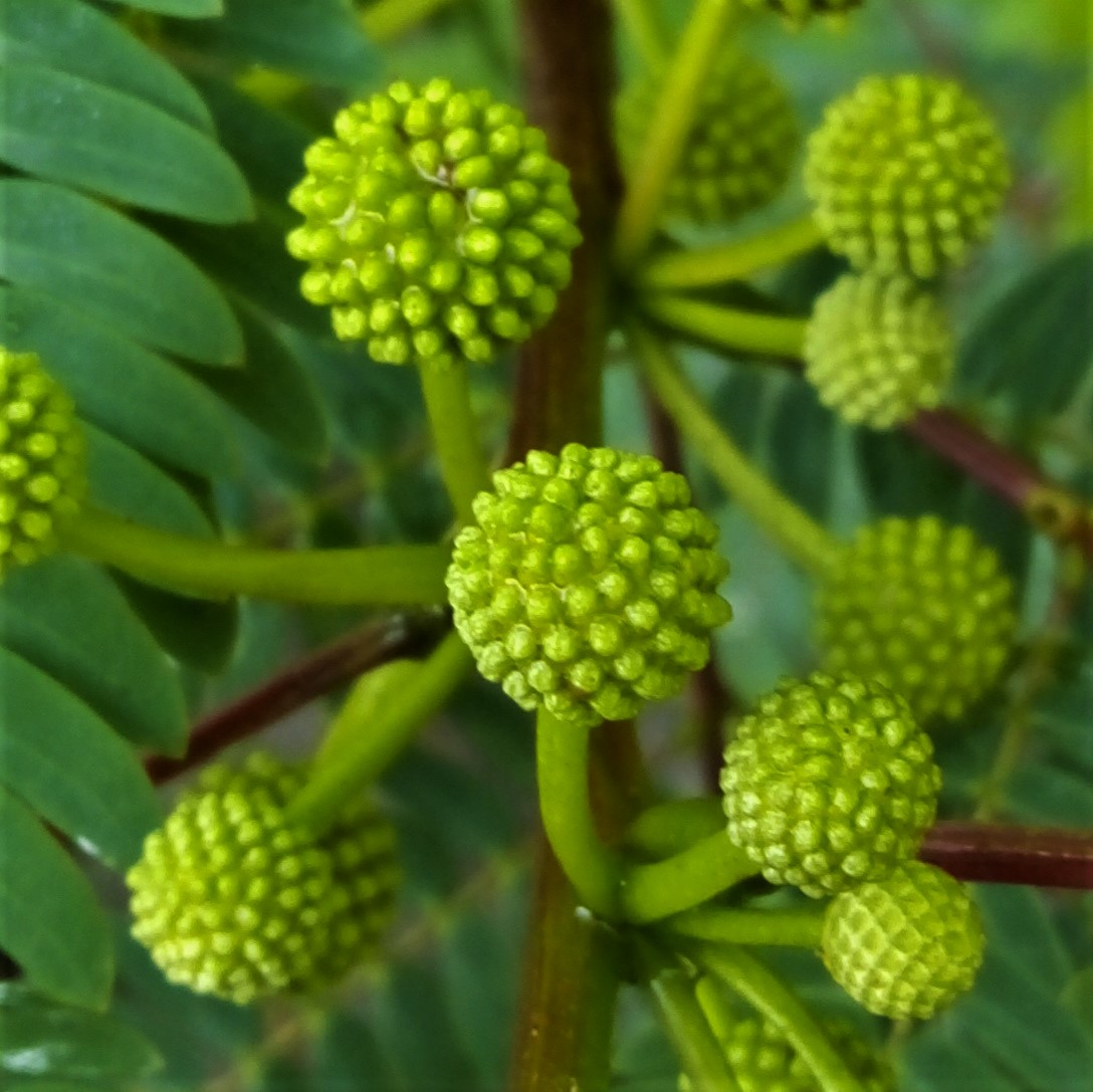 Leucaena Leucocephala is a shrub that is used as food and fodder for livestock. Here I show you the beginning of flowering, its flowers are presented in a type of inflorescence called "Globose Capitulos" because the flowers are grouped forming a spheroid from a single point. Its flowers, which are rather stringy, go from green, white to yellow as they mature.