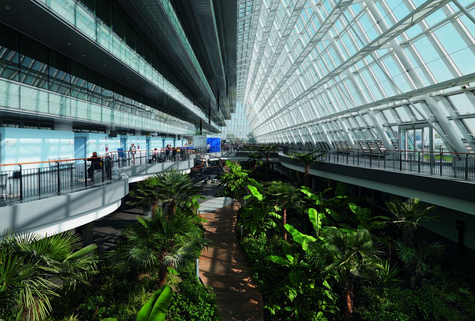 Wind towers installed at the structure's crown are powered by the air that rises through the atrium. The gardens growing inside the tower play the role of lungs, providing air circulation and filtration.