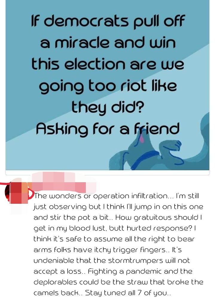 This is what I've been up to.. I infiltrated as many right wing Trumper boot licker groups as I could and I go around using censorship against them.. I'm almost to the stage where Marxism is looking alright and of course those views aren't in alignment with trumptards.. Observation and report is my game..