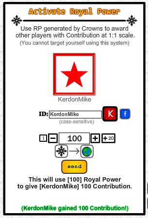 What Royal Power does - it gives the receiver contribution, at 1:1 rate (as you can see on screenshots above). Contribution, when accumulated to certain threshold points, rewards the player with rubies: