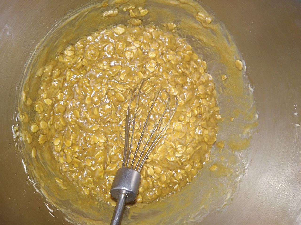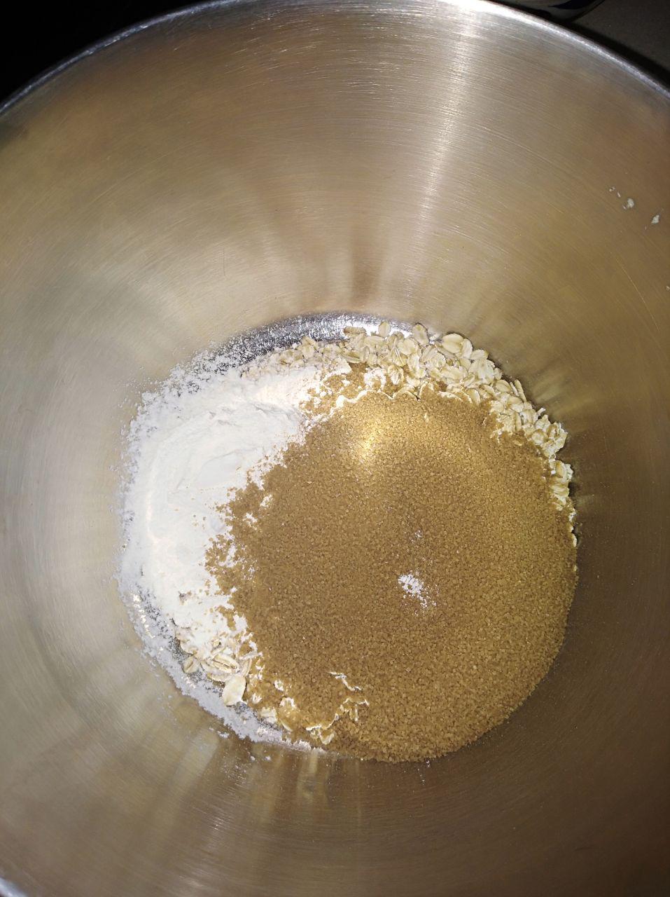 Primero los ingredientes secos, en un tazón agregamos la avena, la harina de trigo, la canela en polvo, la sal, el bicarbonato y el azúcar morena y revolvemos todo.