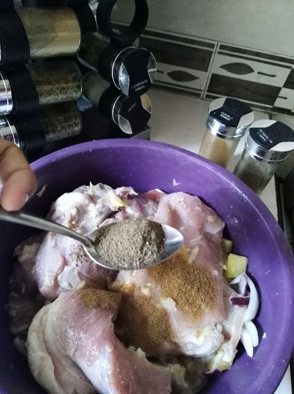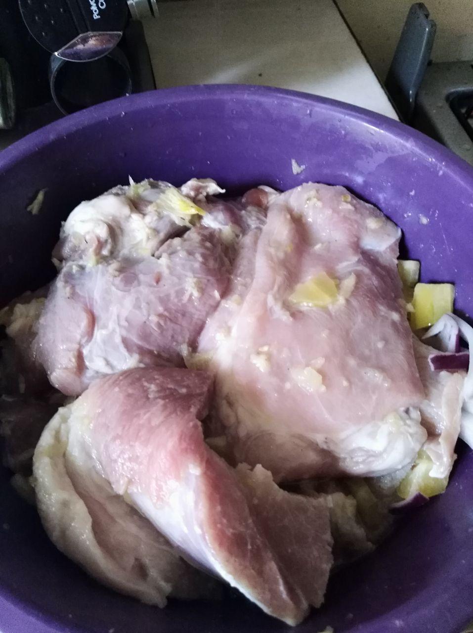 Picamos los dientes de ajo, las cebollas en julianas y agregamos al jugo de naranja a la carne de cerdo junto con la sal.