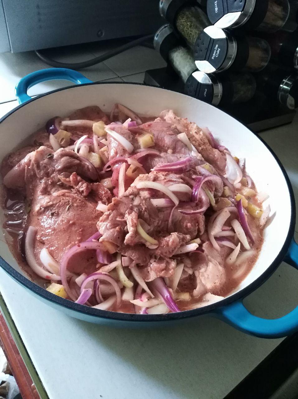 Picamos la cebolla en juliana y la agregamos, dejaremos marinar 5 horas dentro del refrigerador, pasado el tiempo de marinado agregamos aceite o manteca a una cacerola donde hornearemos nuestra cochinita.