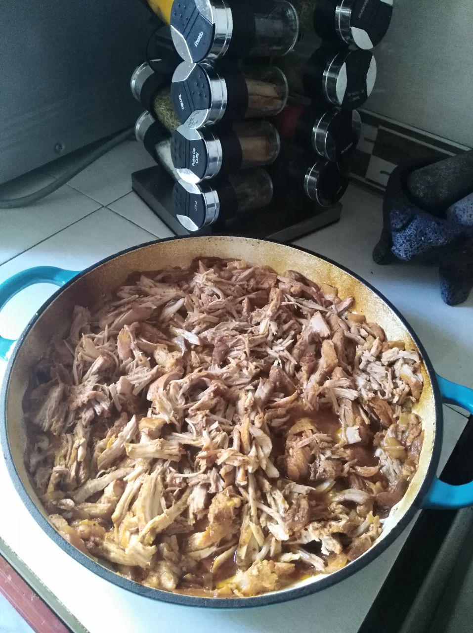 Cuando pasen las 3 horas apagamos el horno y dejamos que se enfríe la cacerola, cuando la destapen ver como la carne soltó más grasa y el color cambió de rojo a un tono amarillo o anaranjado. Con dos tenedores deshebran los trozos de carne y listo. Ya pueden comer su cochinita.
