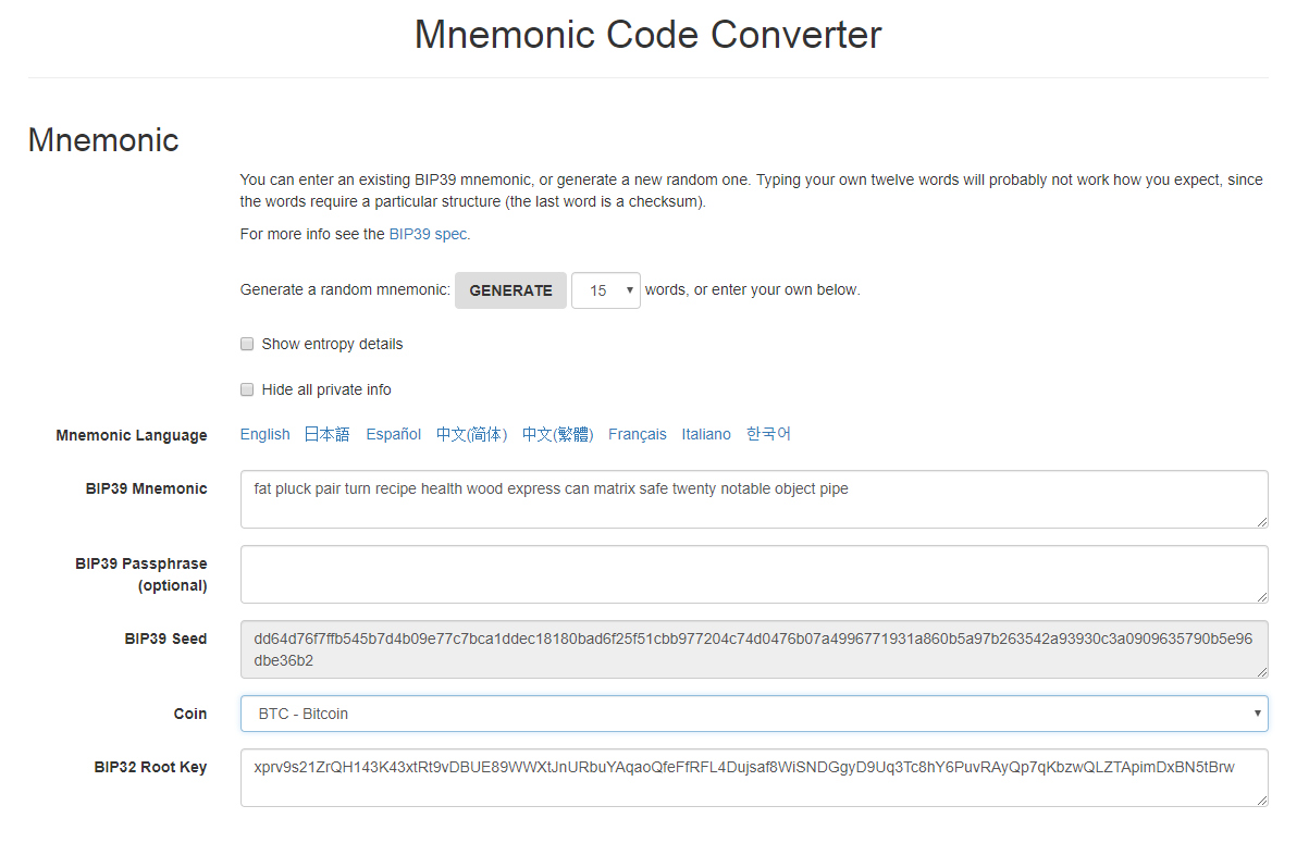 En la creación del monedero si queremos hacerlo por nuestra cuenta y de la manera más segura deberíamos hacerlo sin tener conexión a Internet en ese dispositivo, para ello podemos descargar la herramienta BIP39 de iancoleman y usarla en el dispositivo 100 % seguro sin conexión. Mucho cuidado ya que han aparecido variantes maliciosas de ésta por la red para apoderarse de los bitcoins de los incautos.