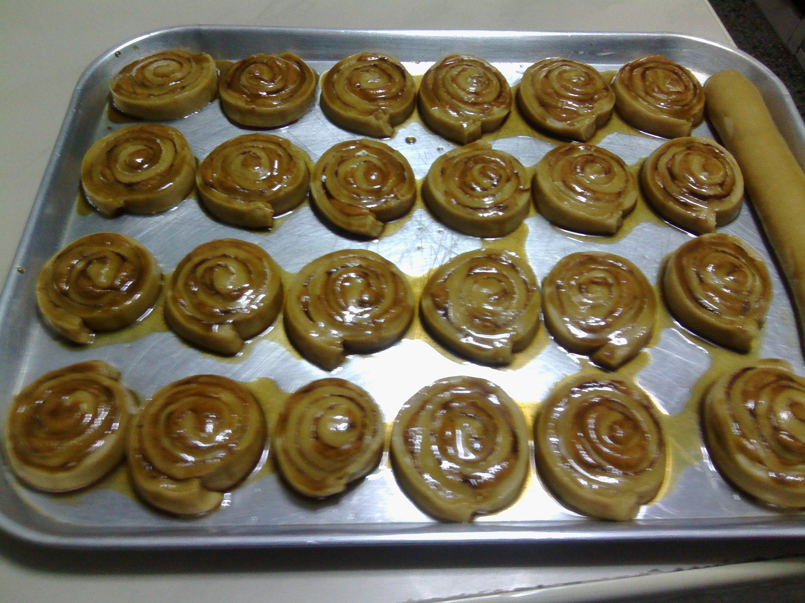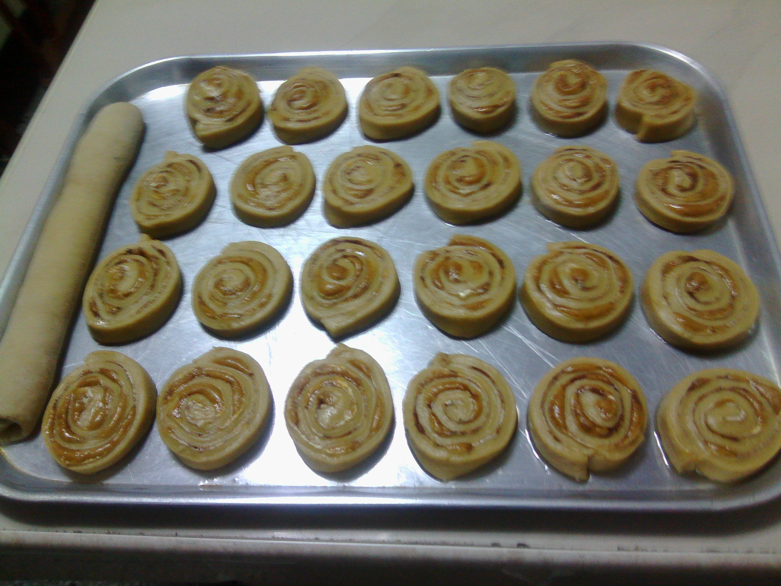 Después de la primera crecida de la masa se baja la masa y se amasa un poco mas. Se extiende en la mesa y se da forma rectangular, embadurnar con mantequilla se le agrega el papelón o azúcar y la canela espolvoreada se enrolla y se corta en rodajas de 2 a 3 cm.