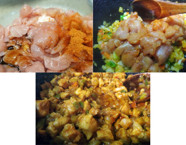 - 나는 닭 가슴살을 깍둑 썰기하고 간장, 소금, 양념을 넣어 양념 한 다음 요리하는 다른 재료와 함께 가마솥에 넣었습니다. 여기에 맛을 내기 위해 양념을 할 수 있습니다. 저는 약간의 설탕을 바르고 쌀과 잘 어울리는 사진에서 보시는 작은 주스가 남을 때까지 요리합니다.