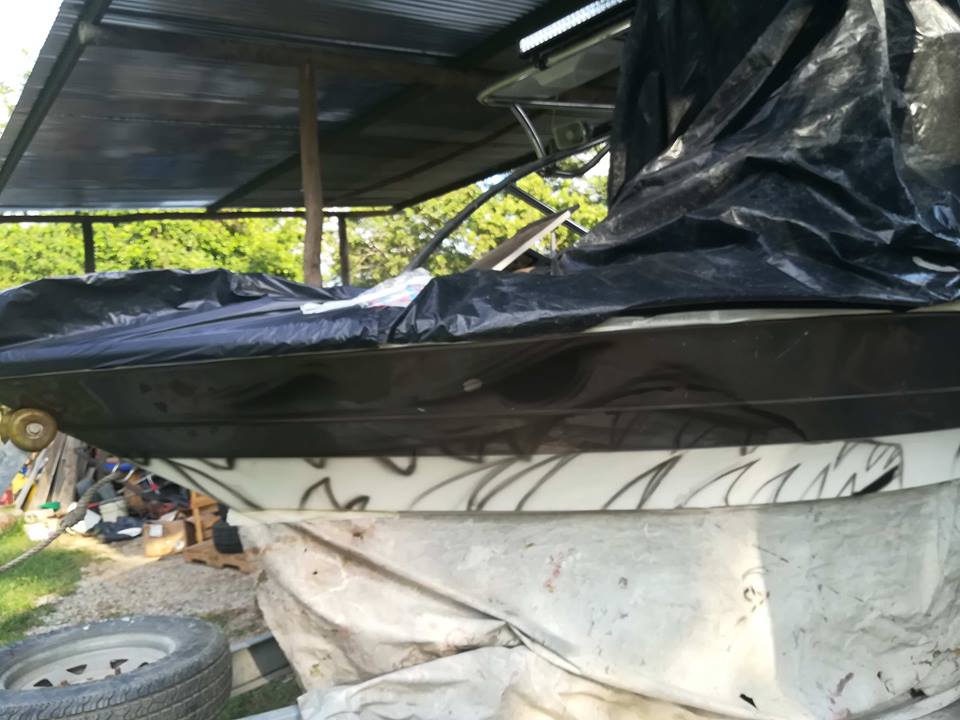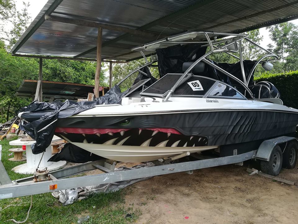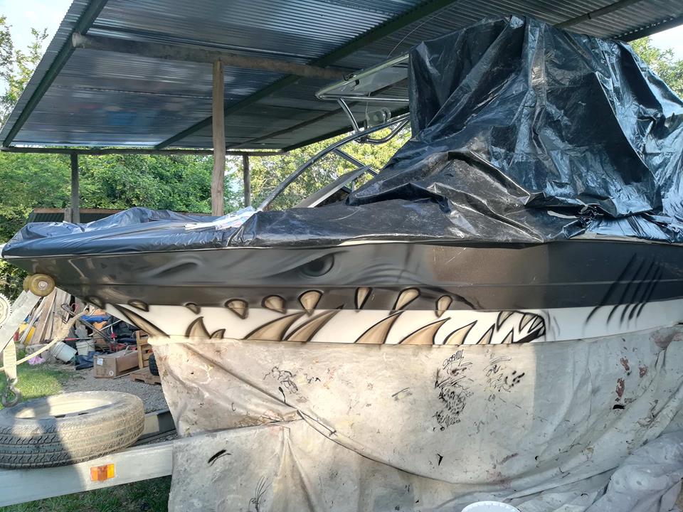 Primero empezamos empapelando las partes de la lancha que no queríamos que se afectaran por la pintura y de ahí empezamos hacer el boceto de un tiburón donde lo indicó el cliente.