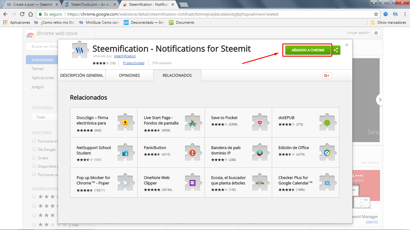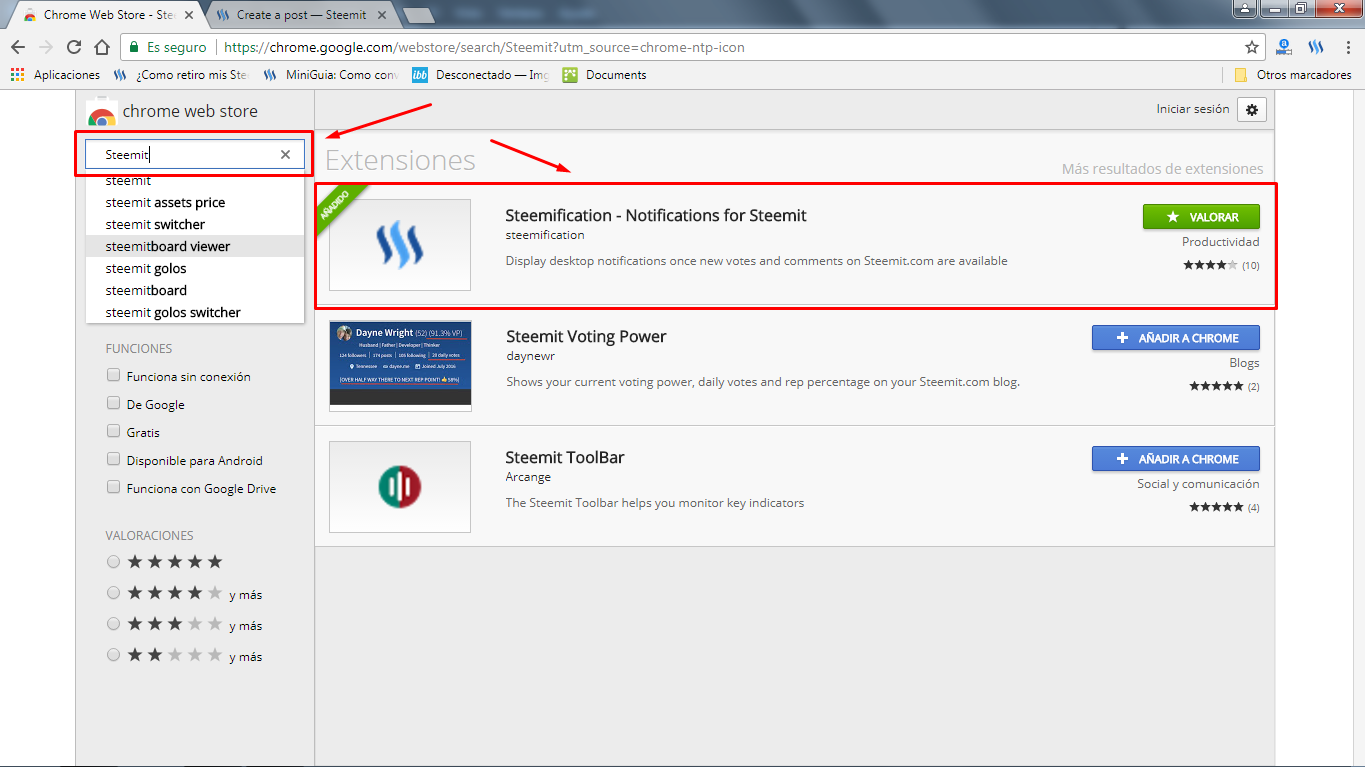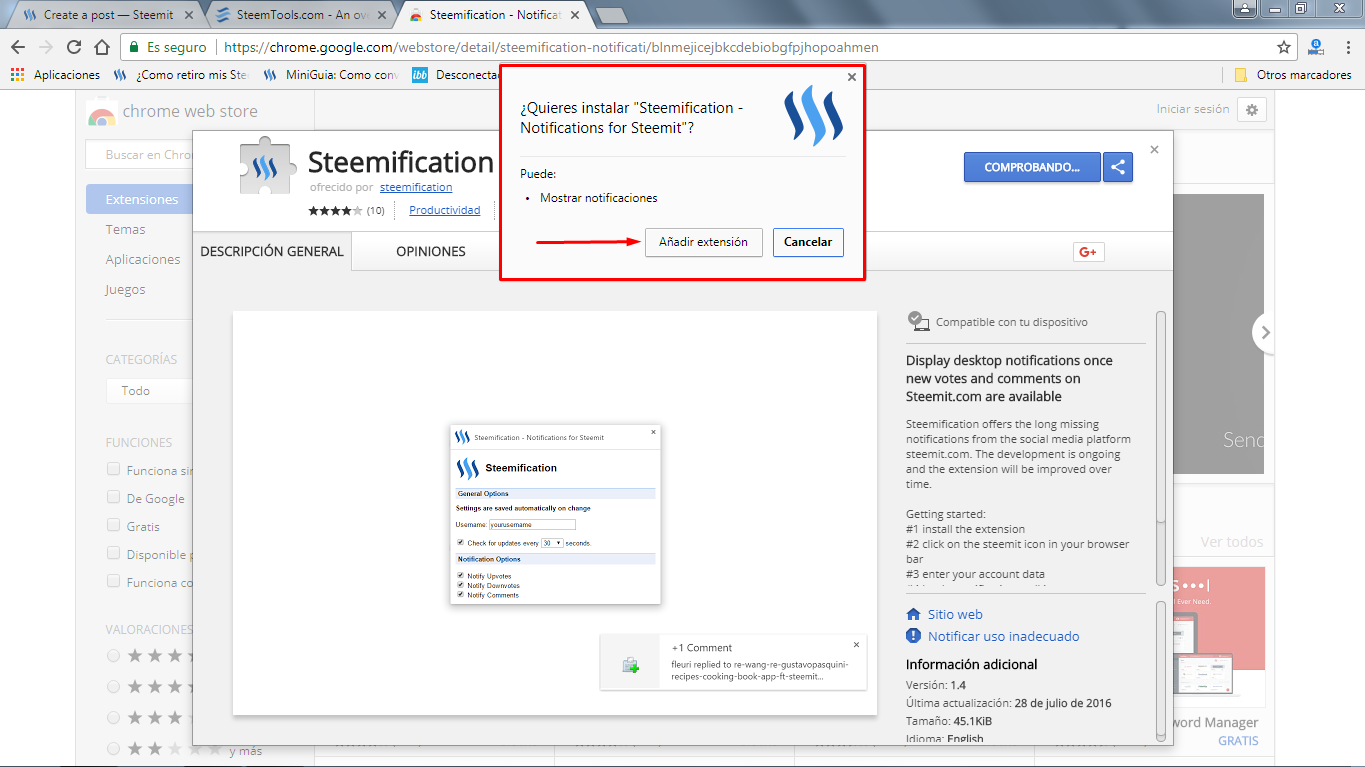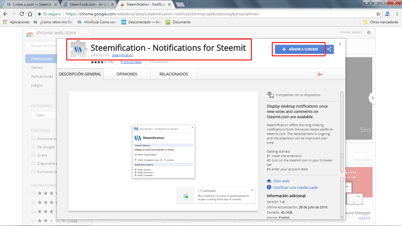 Chrome Web Store: App sobre Notificaciones de Steemit