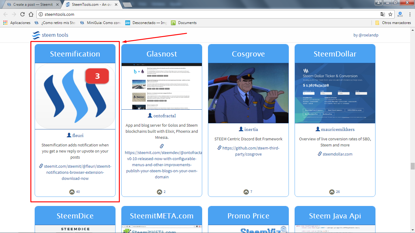 .- A continuación, desplázate hacia abajo y casi al final, ubica la aplicación denominada como: "Steemification" (ver la ilustración que continua, donde se refleja el cuadro en color rojo, señalado por una flecha del mismo color):