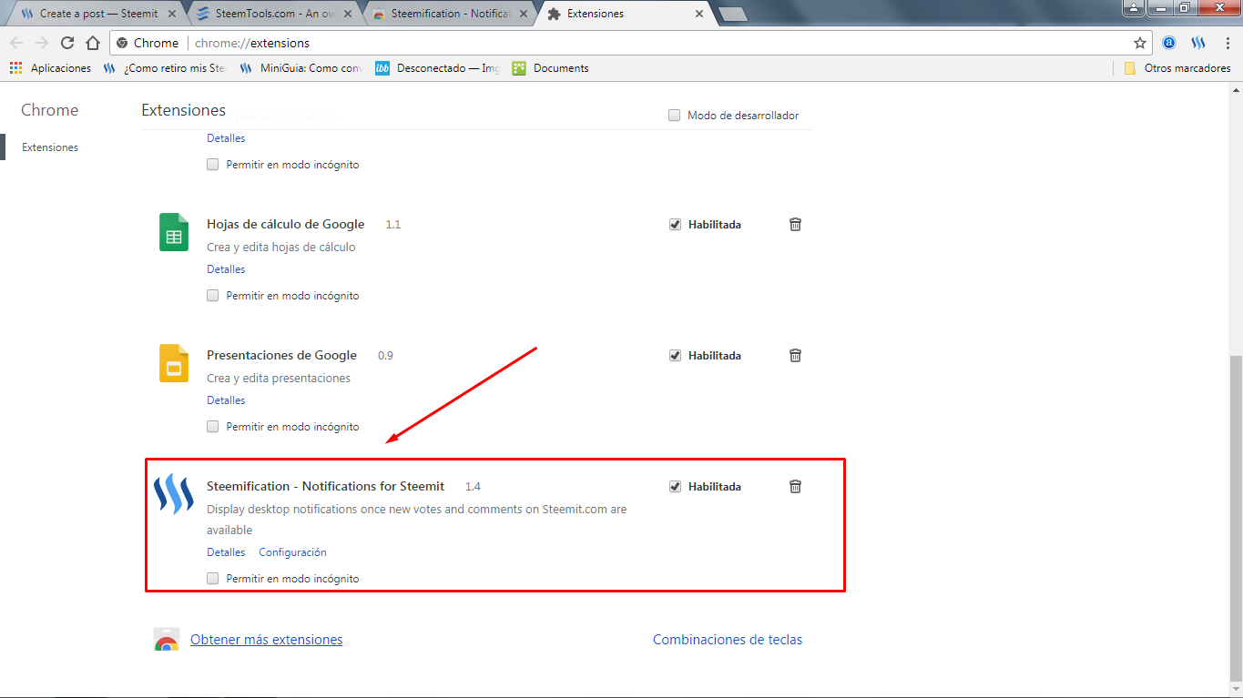 En la sección de Extensiones de Chrome Web Sore, queda reflejada la instalación de la App "Stemification" (ver la ilustración que se añade (ver recuadro y flechado en rojo):