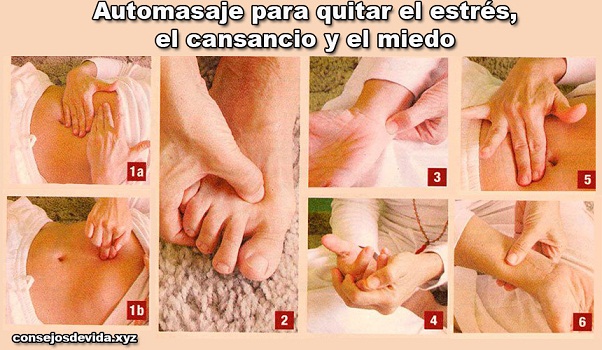 - Manos: Coloca los codos apoyados sobre los muslos, frota la mano derecha sobre la izquierda y luego repite el paso en la otra. Coloca la mano con la palma hacia arriba sujetando la muñeca entre el pulgar y dedo índice (algo parecido a tomar el pulso), masajee la muñeca y base de la palma con el pulgar, realiza movimientos circulares sujetando el dorso de la mano con los dedos.