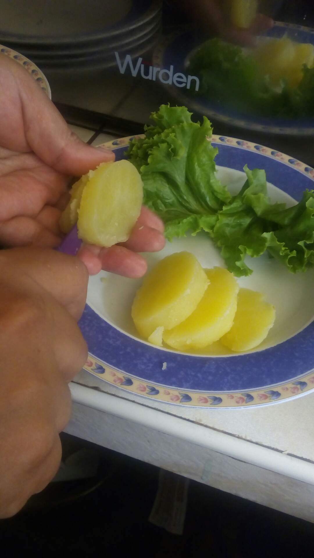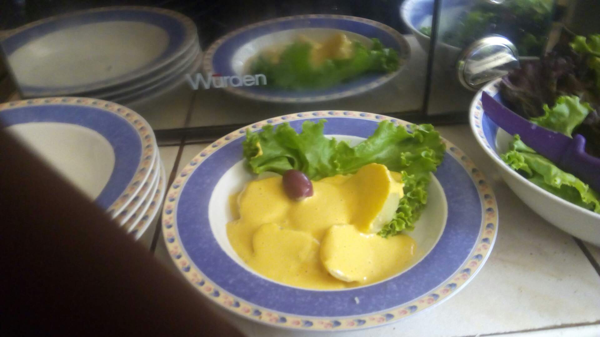 Y procede Dan a emplatar primero corta las papas en rodajas las acomoda en una cama de lechuga, vierte la salsa encima y luego se pone el huevo en mitades, huevito de codorniz y aceituna según el gusto de cada uno.