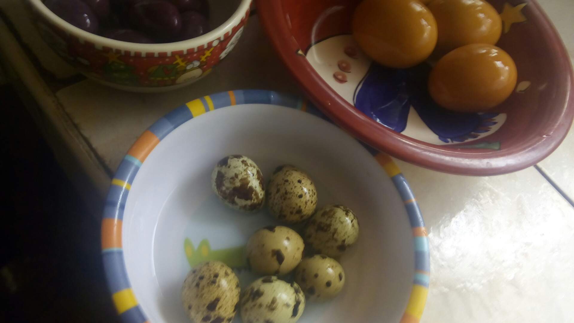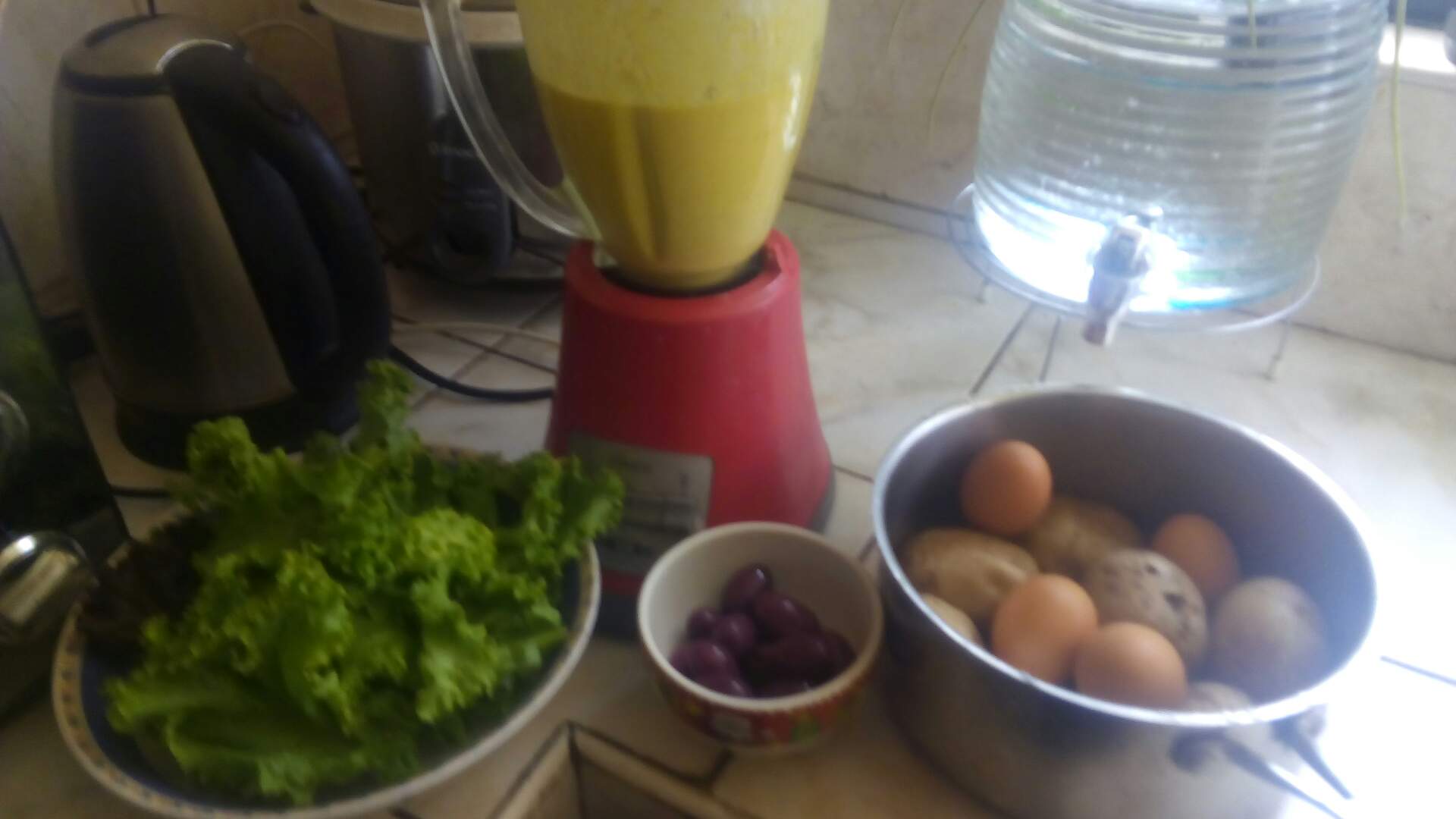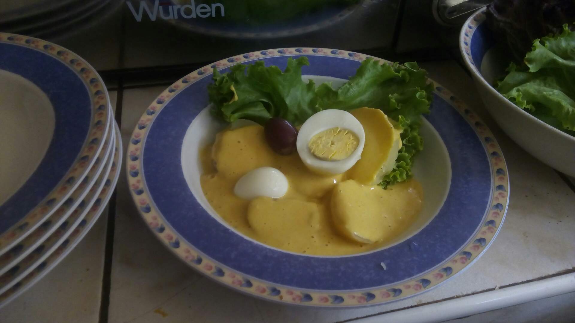 Mientras tanto ya se sancocharon las papas y huevos con las que se servirá el plato, y alistamos también lechuga, aceitunas y también unos huevitos de codorniz para los más chiquitos.
