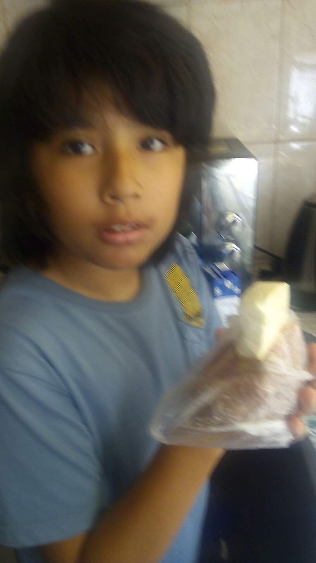 Aquí está Dan con el queso fresco que puso en la licuadora junto con un paquete de galletas de soda